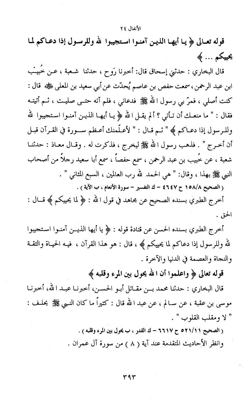قال البخاري: حدثني إسحاق قال: أخبرنا رَوح، حدثنا شعبة، عن خبيْب ابن عبد الرحمن، سمعت حفص بن عاصم يُحدّث عن أبي سعيد بن المعلى - رضي الله عنه - قال: كنت أصلي، فمر بي رسول الله - صَلَّى اللَّهُ عَلَيْهِ وَسَلَّمَ - فدعاني، فلم آته حتى صليت، ثم أتيته فقال: "ما منعك أن تأتي؟ ألم يقل الله (يا أيها الذين آمنوا استجيبوا لله وللرسول إذا دعاكم) "ثم قال: "لأعلّمنك أعظم سورة في القرآن قبل أن أخرج". فذهب رسول الله - صَلَّى اللَّهُ عَلَيْهِ وَسَلَّمَ - ليخرج، فذكرت له. وقال معاذ: حدثنا شعبة، عن خبيب بن عبد الرحمن، سمع حفصاً، سمع أبا سعيد رجلاً من أصحاب النبي - صَلَّى اللَّهُ عَلَيْهِ وَسَلَّمَ - بهذا، وقال: "هي الحمد لله رب العالمين، السبع المثاني".