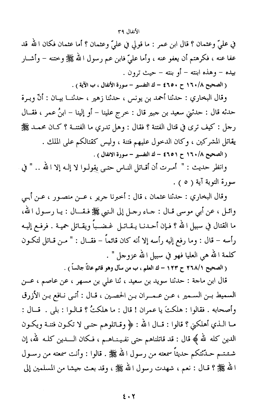 وقال البخاري: حدثنا أحمد بن يونس، حدثنا زهير، حدثنا بيان: أنّ وبرة حدثه قال: حدثني سعيد بن جبير قال: خرج علينا -أو إلينا- ابنُ عمر، فقال رجل: كيف ترى في قتال الفتنة؟ فقال: وهل تدري ما الفتنة؟ كان محمد - صَلَّى اللَّهُ عَلَيْهِ وَسَلَّمَ - يقاتل المشركين، وكان الدخول عليهم فتنة، وليس كقتالكم على الملك.