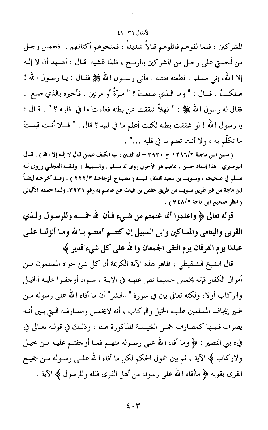 قوله تعالى (واعلموا أنما غنمتم من شيء فإن لله خمسه وللرسول ولذي القربى واليتامى والمساكين وابن السبيل إن كنتم آمنتم بالله وما أنزلنا على عبدنا يوم الفرقان يوم التقى الجمعان والله على كل شيء قدير)