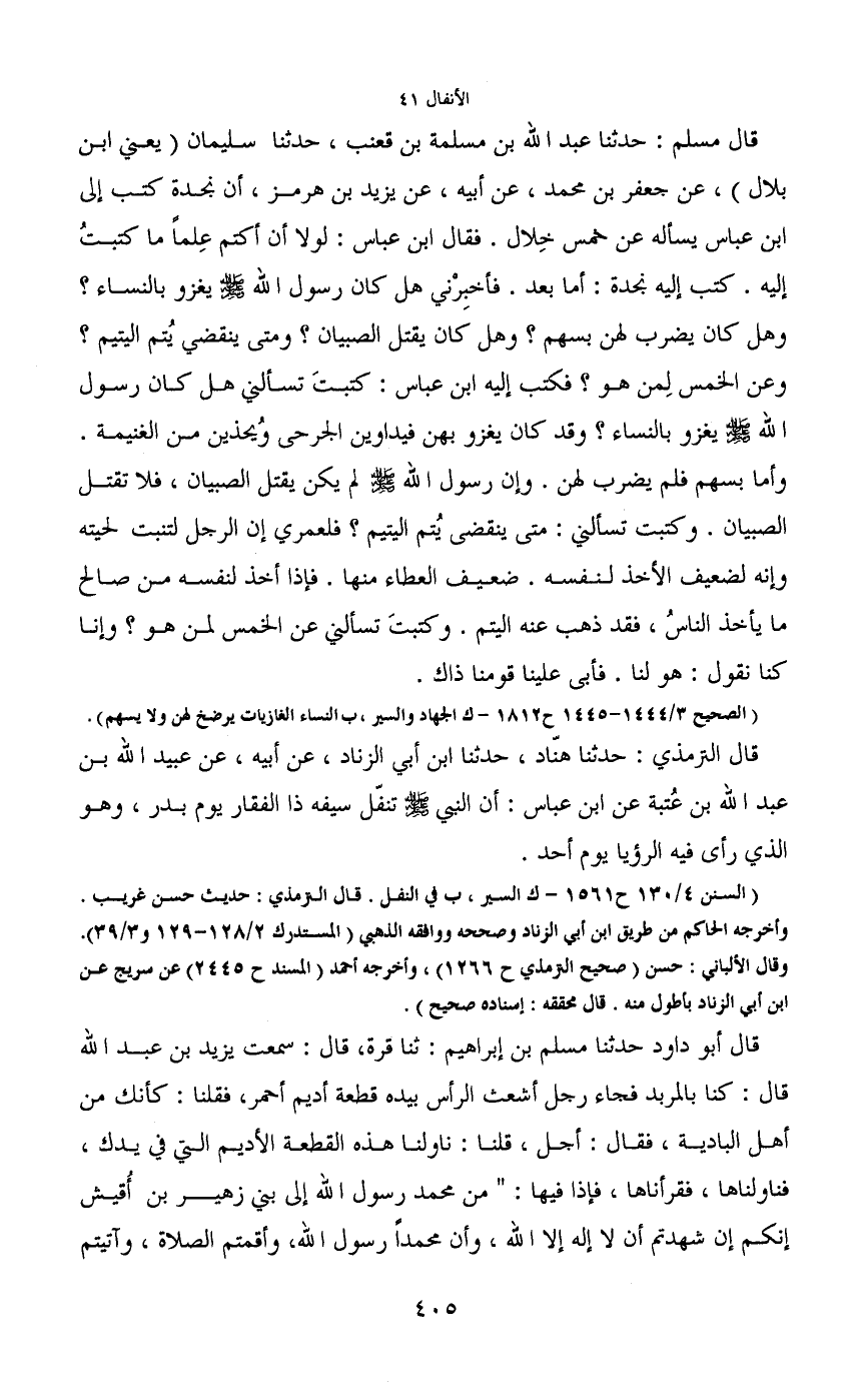 قال مسلم: حدثنا عبد الله بن مسلمة بن قعنب، حدثنا سليمان (يعنى ابن بلال) ، عن جعفر بن محمد، عن أبيه، عن يزيد بن هرمز، أن نجدة كتب إلى ابن عباس يسأله عن خمس خِلال. فقال ابن عباس: لولا أن أكتم عِلماً ما كتبتُ إليه. كتب إليه نجدة: أما بعد. فأخبِرْني هل كان رسول الله - صَلَّى اللَّهُ عَلَيْهِ وَسَلَّمَ - يغزو بالنساء؟ وهل كان يضرب لهن بسهم؟ وهل كان يقتل الصبيان؟ ومتى ينقضي يُتم اليتيم؟ وعن الخمس لِمن هو؟ فكتب إليه ابن عباس: كتبتَ تسألني هل كان رسول الله - صَلَّى اللَّهُ عَلَيْهِ وَسَلَّمَ - يغزو بالنساء؟ وقد كان يغزو بهن فيداوين الجرحى وُيحذين من الغنيمة. وأما بسهم فلم يضرب لهن. وإن رسول الله - صَلَّى اللَّهُ عَلَيْهِ وَسَلَّمَ - لم يكن يقتل الصبيان، فلا تقتل الصبيان. وكتبت تسألني: متى ينقضي يُتم اليتيم؟ فلعمري إن الرجل لتنبت لحيته وإنه لضعيف الأخذ لنفسه. ضعيف العطاء منها. فإذا أخذ لنفسه من صالح ما يأخذ الناس، فقد ذهب عنه اليتم. وكتبتَ تسألني عن الخمس لمن هو؟ وإنا كنا نقول: هو لنا. فأبى علينا قومنا ذاك.