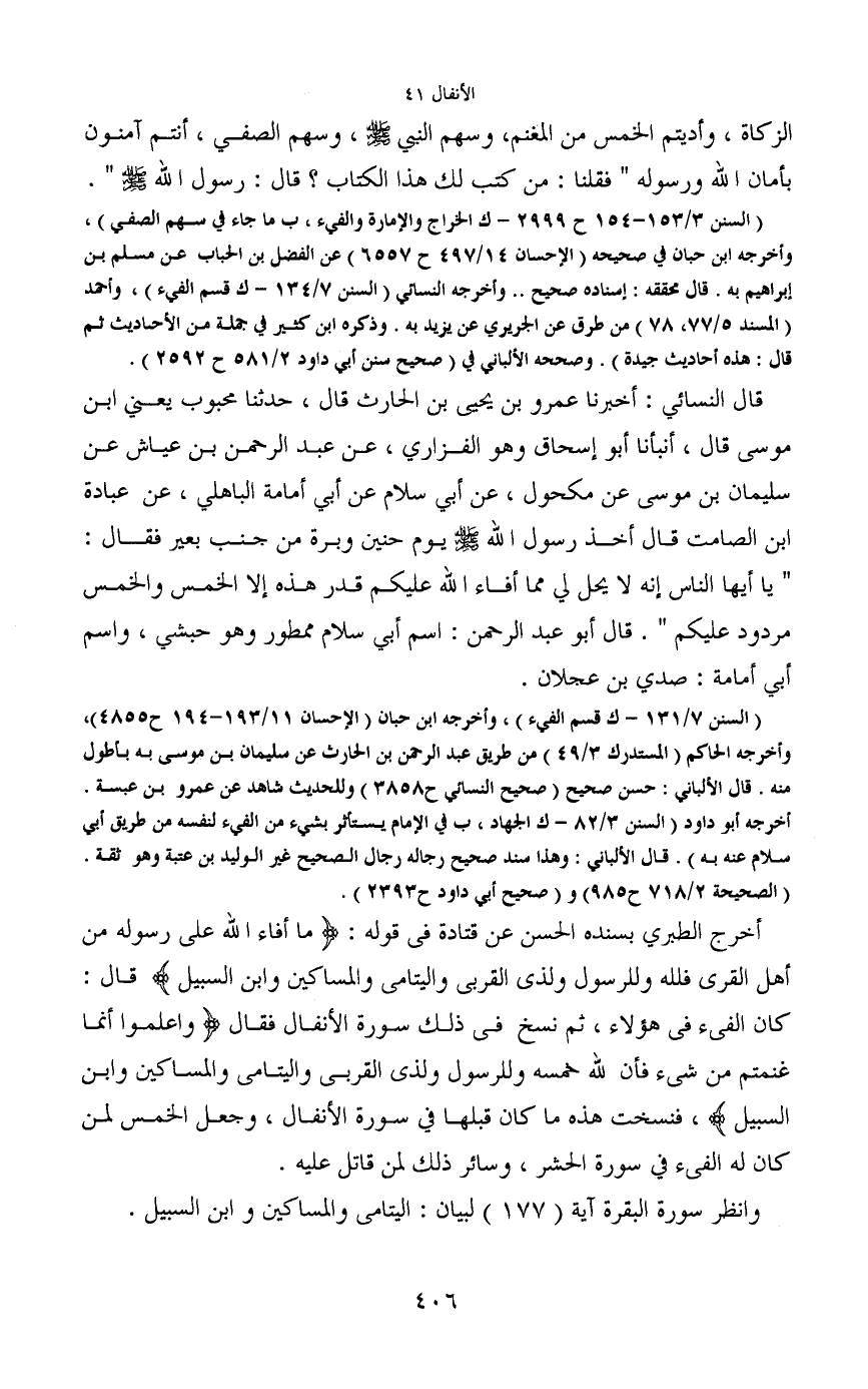 قال النسائي: أخبرنا عمرو بن يحيى بن الحارث قال، حدثنا محبوب يعني ابن موسى قال، أنبأنا أبو إسحاق وهو الفزاري، عن عبد الرحمن بن عياش عن سليمان بن موسى عن مكحول، عن أبي سلام عن أبي أمامة الباهلي، عن عبادة ابن الصامت قال أخذ رسول الله - صَلَّى اللَّهُ عَلَيْهِ وَسَلَّمَ - يوم حنين وبرة من جنب بعير فقال: "يا أيها الناس إنه لا يحل لي مما أفاء الله عليكم قدر هذه إلا الخمس والخمس مردود عليكم". قال أبو عبد الرحمن: اسم أبي سلام ممطور وهو حبشي، واسم أبي أمامة: صدي بن عجلان.