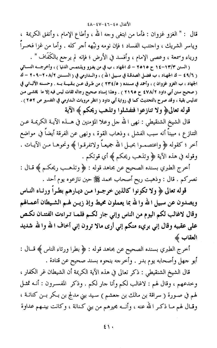 قال الشيخ الشنقيطي: نهى الله جل وعلا المؤمنين في هذه الآية الكريمة عن التنازع، مبيناً أنه سبب الفشل، وذهاب القوة، ونهى عن الفرقة أيضاً في مواضع أخر؛ كقوله (واعتصموا بحبل الله جميعاً ولا تفرقوا) ونحوها من الآيات.