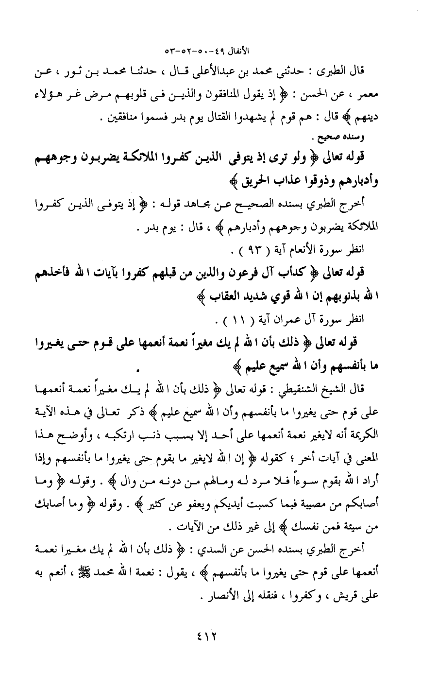 قال الشيخ الشنقيطي: قوله تعالى (ذلك بأن الله لم يك مغيراً نعمة أنعمها على قوم حتى يغيروا ما بأنفسهم وأن الله سميع عليم) ذكر تعالى في هذه الآية الكريمة أنه لا يغير نعمة أنعمها على أحد إلا بسبب ذنب ارتكبه، وأوضح هذا المعنى في آيات أخر؛ كقوله (إن الله لا يغير ما بقوم حتى يغيروا ما بأنفسهم وإذا أراد الله بقوم سوءاً فلا مرد له وما لهم من دونه من وال) . وقوله (وما أصابكم من مصيبة فبما كسبت أيديكم ويعفو عن كثير) . وقوله (وما أصابك من سيئة فمن نفسك) إلى غير ذلك من الآيات.