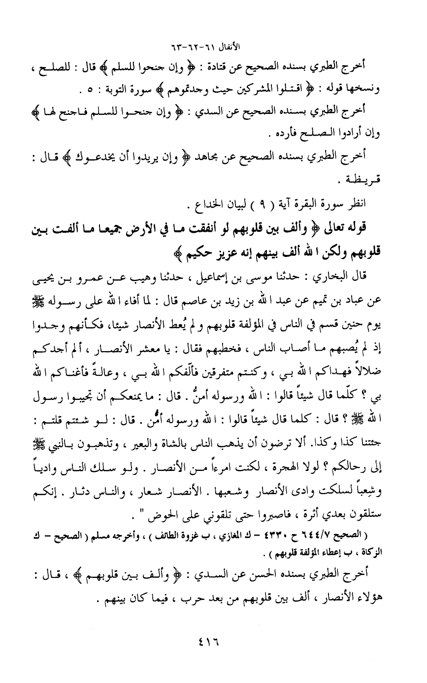 أخرج الطبري بسنده الحسن عن السدي: (وألف بين قلوبهم) ، قال: هؤلاء الأنصار، ألف بين قلوبهم من بعد حرب، فيما كان بينهم.