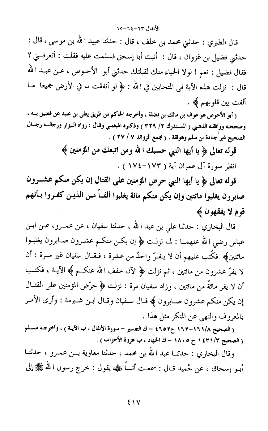 قال البخاري: حدثنا علي بن عبد الله، حدثنا سفيان، عن عمرو، عن ابن عباس رضي الله عنهما: لما نزلت (إن يكن منكم عشرون صابرون يغلبوا مائتين) فكتب عليهم أن لا يفرّ واحدٌ من عشرة، فقال سفيان غير مرة: أن لا يفرّ عشرون من مائتين، ثم نزلت (الآن خفف الله عنكم) الآية، فكتب أن لا يفر مائة من مائتين، وزاد سفيان مرة: نزلت (حرّض المؤمنين على القتال إن يكن منكم عشرون صابرون) قال سفيان وقال ابن شبرمة: وأرى الأمر بالمعروف والنهي عن المنكر مثل هذا.