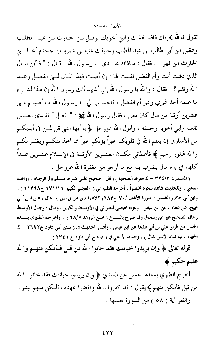 (المستدرك 3/324 - ك معرفة الصحابة) وقال: صحيح على شرط مسلم ولم يخرجاه، ووافقه الذهبي. وللحديث شاهد بنحوه مختصراً، أخرجه الطبراني (المعجم الكبير 11/171 ح 11398) ، وابن أبي حاتم (التفسير - سورة الأنفال/70 ح 683) كلاهما من طريق ابن إسحاق، عن ابن أبي نجيح، عن عطاء، عن ابن عباس. وعزاه الهيثمي للطبراني في الأوسط والكبير، وقال: رجال الأوسط رجال الصحيح غير ابن إسحاق وقد صرح بالسماع (مجمع الزوائد 7/28) ، وأخرجه الطبري بسنده الحسن من طريق علي بن أبي طلحة عن ابن عباس. وأصل الحديث في (سنن أبي داود ح 2692 - ك الجهاد، ب فداء الأسير بالمال) ، وحسنه الألباني في (صحيح أبي داود ح 2341) .
