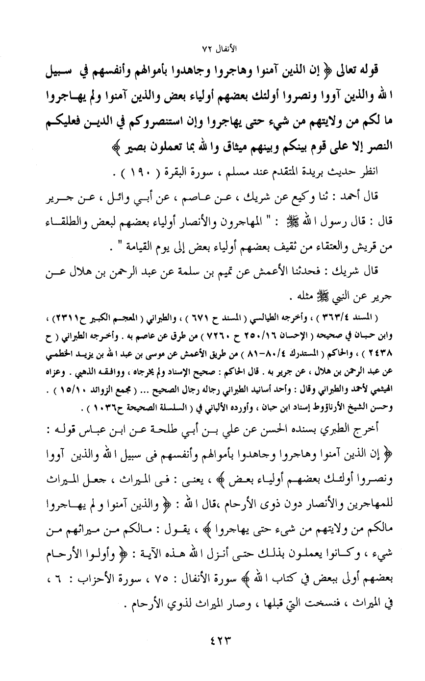 أخرج الطبري بسنده الحسن عن علي بن أبي طلحة عن ابن عباس قوله: (إن الذين آمنوا وهاجروا وجاهدوا بأموالهم وأنفسهم في سبيل الله والذين آووا ونصروا أولئك بعضهم أولياء بعض) ، يعنى: في الميراث، جعل الميراث للمهاجرين والأنصار دون ذوى الأرحام، قال الله: (والذين آمنوا ولم يهاجروا مالكم من ولايتهم من شيء حتى يهاجروا) ، يقول: مالكم من ميراثهم من شيء، وكانوا يعملون بذلك حتى أنزل الله هذه الآية: (وأولوا الأرحام بعضهم أولى ببعض في كتاب الله) سورة الأنفال: 75، سورة الأحزاب: 6، في الميراث، فنسخت التي قبلها، وصار الميراث لذوي الأرحام.