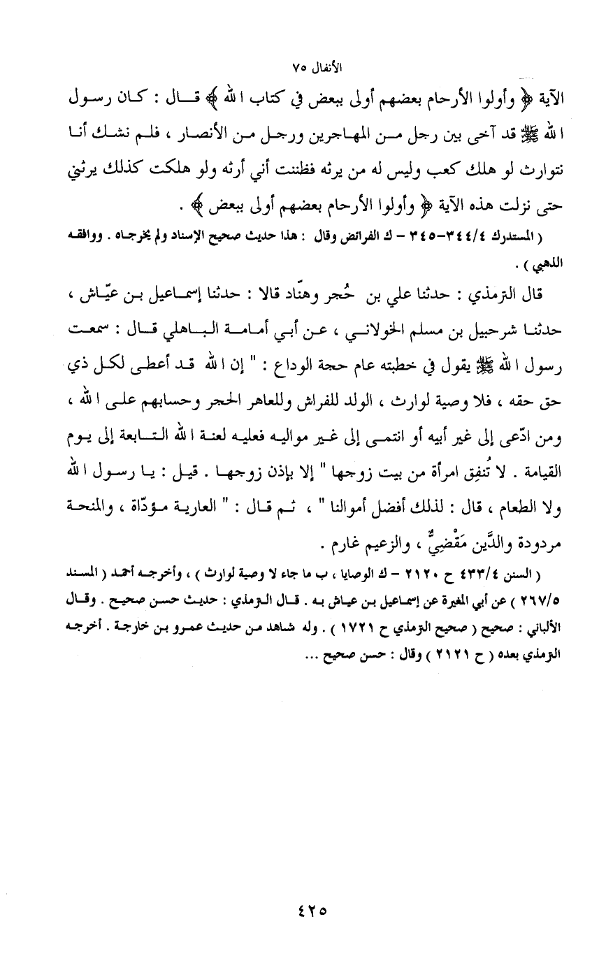 (السنن 4/433 ح 2120 - ك الوصايا، ب ما جاء لا وصية لوارث) ، وأخرجه أحمد (المسند 5/267) عن أبي المغيرة عن إسماعيل بن عياش به. قال الترمذي: حديث حسن صحيح. وقال الألباني: صحيح (صحيح الترمذي ح 1721) . وله شاهد من حديث عمرو بن خارجة. أخرجه الترمذي بعده (ح 2121) وقال: حسن صحيح ...