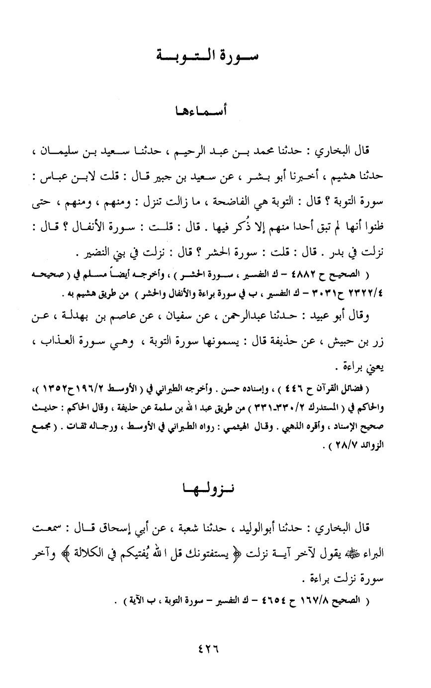 قال البخاري: حدثنا محمد بن عبد الرحيم، حدثنا سعيد بن سليمان، حدثنا هشيم، أخبرنا أبو بشر، عن سعيد بن جبير قال: قلت لابن عباس: سورة التوبة؟ قال: التوبة هي الفاضحة، ما زالت تنزل: ومنهم، ومنهم، حتى ظنوا أنها لم تبق أحداً منهم إلا ذكر فيها. قال: قلت: سورة الأنفال؟ قال: نزلت في بدر. قال: قلت: سورة الحشر؟ قال: نزلت في بني النضير.