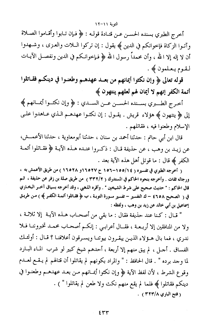 "قال: كنا عند حذيفة فقال: ما بقى من أصحاب هذه الآية إلا ثلاثة، ولا من المنافقين إلا أربعة، فقال أعرابي: إنكم أصحاب محمد تخبروننا فلا ندري، فما بال هؤلاء الذين يبقرون بيوتنا ويسرقون أعلافنا؟ قال: أولئك الفساق. أجل، لم يبق منهم إلا أربعة، أحدهم شيخ كبير لو شرب الماء البارد لما وجد برده". قال الحافظ: "والمراد بكونهم لم يقاتلوا أن قتالهم لم يقع لعدم وقوع الشرط، لأن لفظ الآية (وإن نكثوا أيمانهم من بعد عهدهم وطعنوا في دينكم فقاتلوا) فلما لم يقع منهم نكث ولا طعن لم يقاتلوا") .