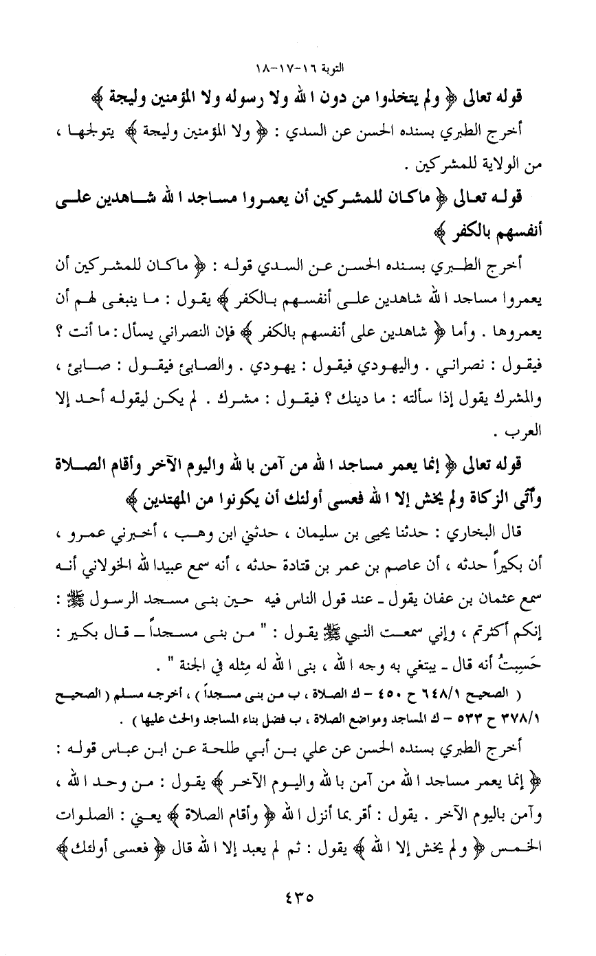 أخرج الطبري بسنده الحسن عن علي بن أبي طلحة عن ابن عباس قوله: (إنما يعمر مساجد الله من أمن بالله واليوم الآخر) يقول: من وحد الله، وأمن باليوم الآخر. يقول: أقر بما أنزل الله (وأقام الصلاة) يعني: الصلوات الخمس (ولم يخش إلا الله) يقول: ثم لم يعبد إلا الله قال (فعسى أولئك)
