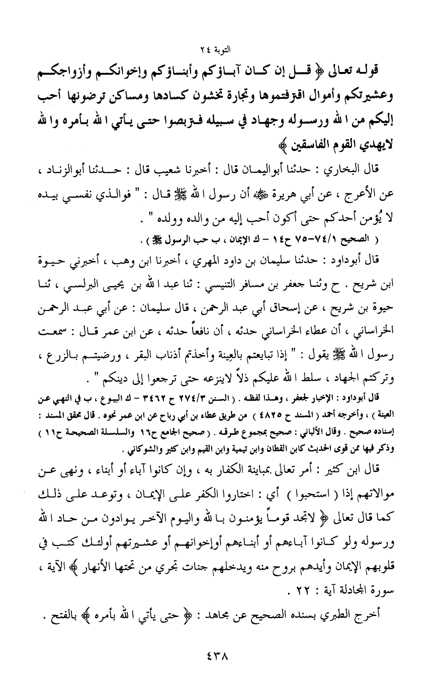 قوله تعالى (قل إن كان آباؤكم وآبناؤكم وإخوانكم وأزواجكم وعشيرتكم وأموال اقترفتموها وتجارة تخشون كسادها ومساكن ترضونها أحب إليكم من الله ورسوله وجهاد في سبيله فتربصوا حتى يأتي الله بأمره والله لا يهدي القوم الفاسقين)