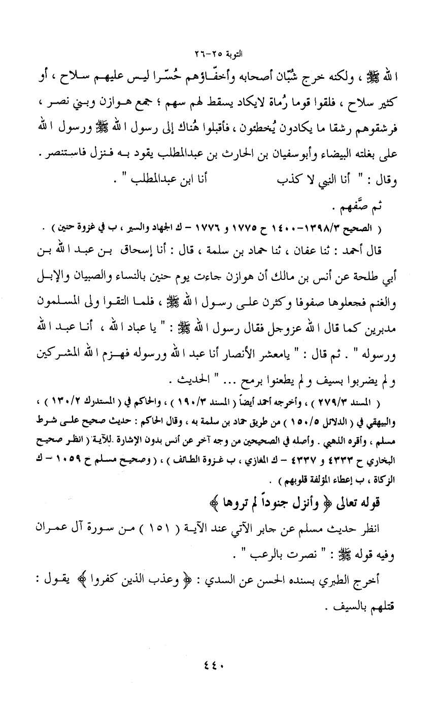 الله - صَلَّى اللَّهُ عَلَيْهِ وَسَلَّمَ -، ولكنه خرج شبان أصحابه وأخفْاؤهم حُسّرا ليس عليهم سلاح، أو كثير سلاح، فلقوا قوما رُماة لا يكاد يسقط لهم سهم؛ جمع هوازن وبني نصر، فرشقوهم رشقا ما يكادون يُخطئون، فأقبلوا هناك إلى رسول الله - صَلَّى اللَّهُ عَلَيْهِ وَسَلَّمَ - ورسول الله على بغلته البيضاء وأبو سفيان بن الحارث بن عبد المطب يقود به فنزل فاستنصر.
