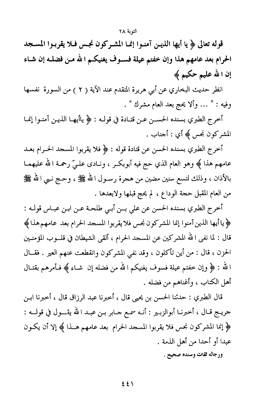 أخرج الطبري بسنده الحسن عن علي بن أبي طلحة عن ابن عباس قوله: (يا أيها الذين آمنوا إنما المشركون نجس فلا يقربوا المسجد الحرام بعد عامهم هذا) قال: لما نفى الله المشركين عن المسجد الحرام، ألقى الشيطان في قلوب المؤمنين الحزن، قال: من أين تأكلون، وقد نفي المشركون وانقطعت عنهم العير. فقال الله: (وإن خفتم عيلة فسوف يغنيكم الله من فضله إن شاء) فأمرهم بقتال أهل الكتاب، وأغناهم من فضله.