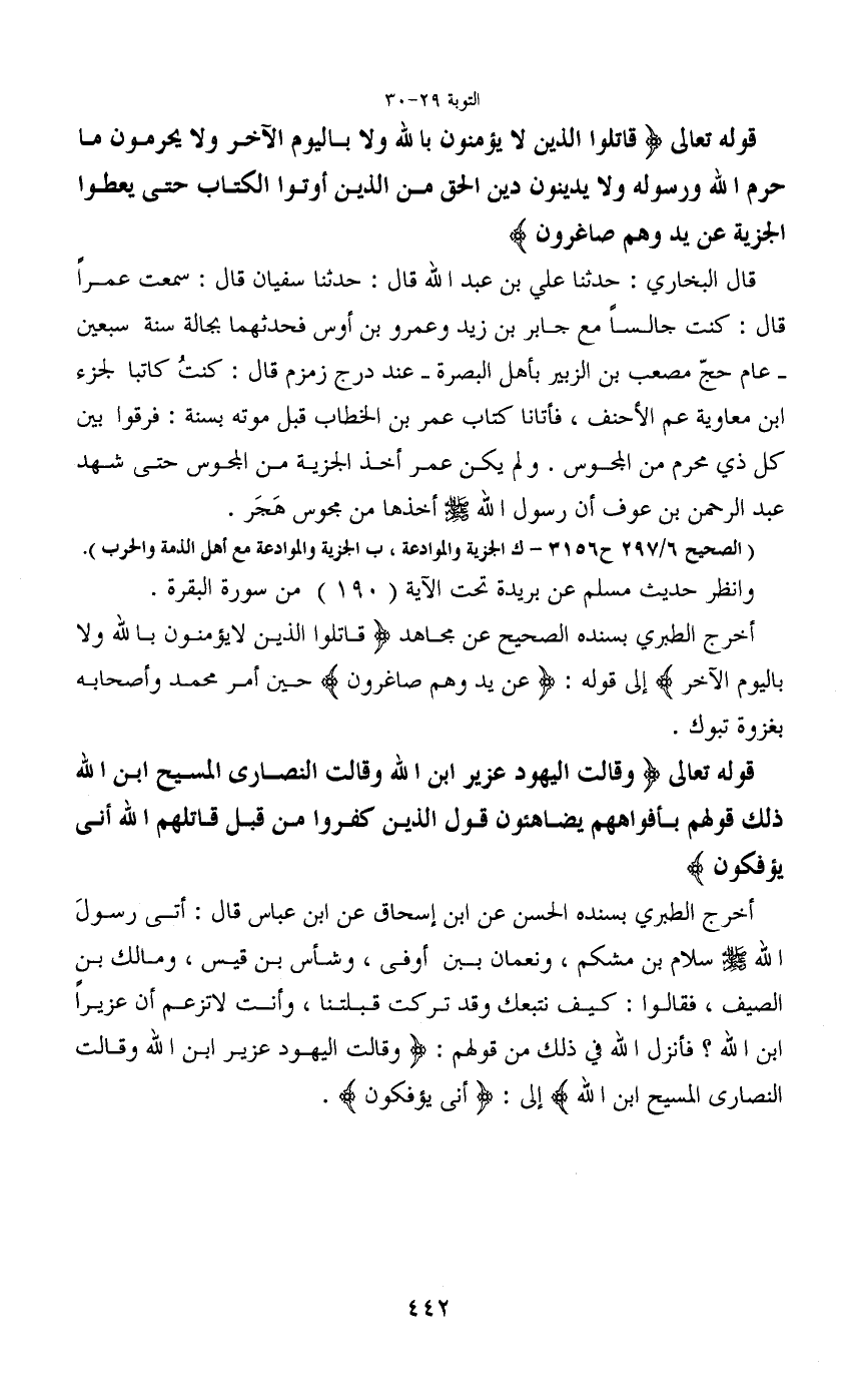 أخرج الطبري بسنده الصحيح عن مجاهد (قاتلوا الذين لا يؤمنون بالله ولا باليوم الآخر) إلى قوله: (عن يد وهم صاغرون) حين أمر محمد وأصحابه بغزوة تبوك.