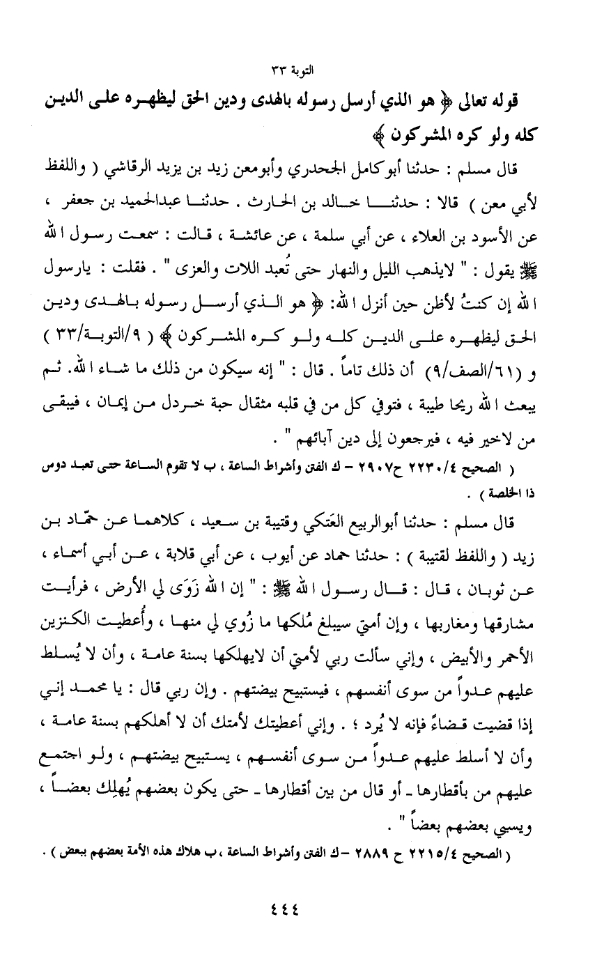قال مسلم: حدثنا أبو كامل الجحدري وأبو معن زيد بن يزيد الرقاشي (واللفظ لأبي معن) قالا: حدثنا خالد بن الحارث. حدثنا عبد الحميد بن جعفر، عن الأسود بن العلاء، عن أبي سلمة، عن عائشة، قالت: سمعت رسول الله - صَلَّى اللَّهُ عَلَيْهِ وَسَلَّمَ - يقول: "لا يذهب الليل والنهار حتى تُعبد اللات والعزى". فقلت: يا رسول الله إن كنتُ لأظن حين أنزل الله: (هو الذي أرسل رسوله بالهدى ودين الحق ليظهره على الدين كله ولو كره المشركون) (9/التوبة/33) و (61/الصف/9) أن ذللك تاماً. قال: "إنه سيكون من ذلك ما شاء الله. ثم يبعث الله ريحا طيبة، فتوفي كل من في قلبه مثقال حبة خردل من إيمان، فيبقى من لا خير فيه، فيرجعون إلى دين أبائهم".