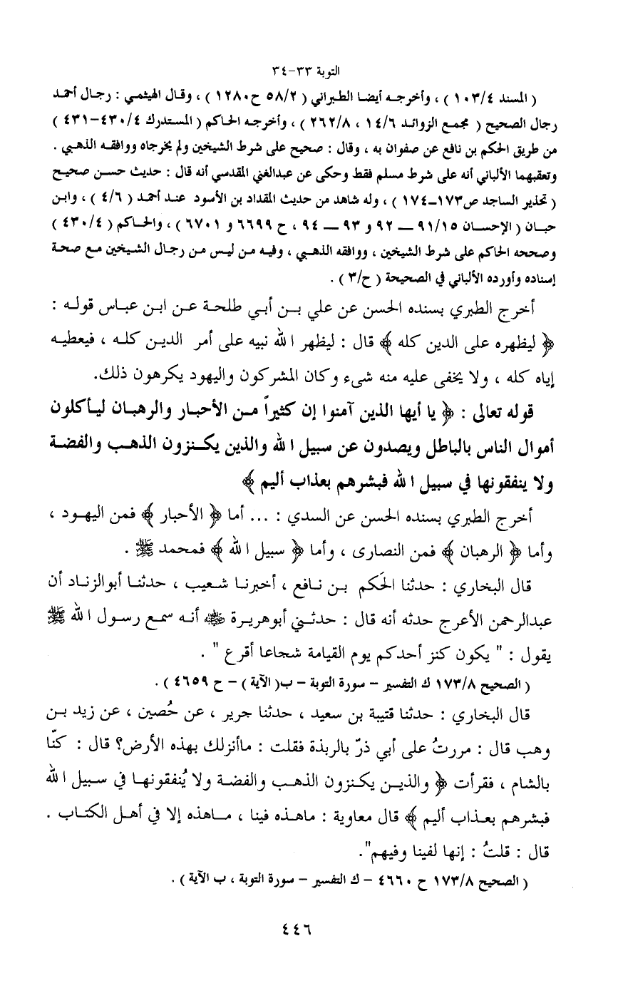 قوله تعالى: (يا أيها الذين آمنوا إن كثيراً من الأحبار والرهبان ليأكلون أموال الناس بالباطل ويصدون عن سبيل الله والذين يكنزون الذهب والفضة ولا ينفقونها في سبيل الله فبشرهم بعذاب أليم)