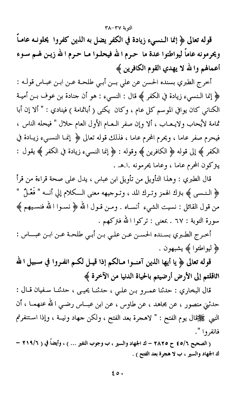 قال الطبري: وهذا التأويل من تأويل ابن عباس، يدل على صحة قراءة من قرأ (النسى) بترك الهمز وترك المد، وتوجيهه معنى الكلام إلى أنه "فَعْل" من قول القائل: نسيت الشيء أنساه. ومن قول الله (نسوا الله فنسيهم) سورة التوبة: 67. بمعنى: تركوا الله فتركهم.