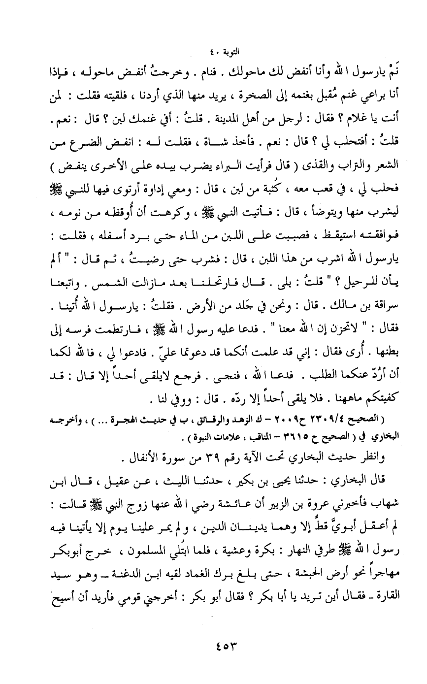 قلتُ: أفتحلب لي؟ قال: نعم. فأخذ شاة، فقلت له: انفض الضرع من الشعر والتراب والقذى (قال فرأيت البراء يضرب بيده على الأخرى ينفض) فحلب لي، في قعب معه، كثبة من لبن، قال: ومعي إداوة أرتوى فيها للنبي - صَلَّى اللَّهُ عَلَيْهِ وَسَلَّمَ - ليشرب منها ويتوضأ، قال: فأتيت النبي - صَلَّى اللَّهُ عَلَيْهِ وَسَلَّمَ -، وكرهت أن أُوقظه من نومه، فوافقته استيقظ، فصببت على اللبن من الماء حتى برد أسفله، فقلت: يا رسول الله اشرب من هذا اللبن، قال: فشرب حتى رضيتُ، ثم قال: "ألم يأن للرحيل؟ " قلتُ: بلى. قال فارتحلنا بعد مازالت الشمس. واتبعنا سراقة بن مالك. قال: ونحن في جَلد من الأرض. فقلت: يا رسول الله أُتينا. فقال: "لا تحزن إن الله معنا". فدعا عليه رسول الله - صَلَّى اللَّهُ عَلَيْهِ وَسَلَّمَ -، فارتطمت فرسه إلى بطنها. أُرى فقال: إني قد علمت أنكما قد دعوتما عليّ. فأدعوا لي، فالله لكما أن أرُد عنكما الطلب. فدعا الله، فنجى. فرجع لا يلقى أحداً إلا قال: قد كفيتكم ماههنا. فلا يلقى أحداً إلا ردّه. قال: ووفي لنا.