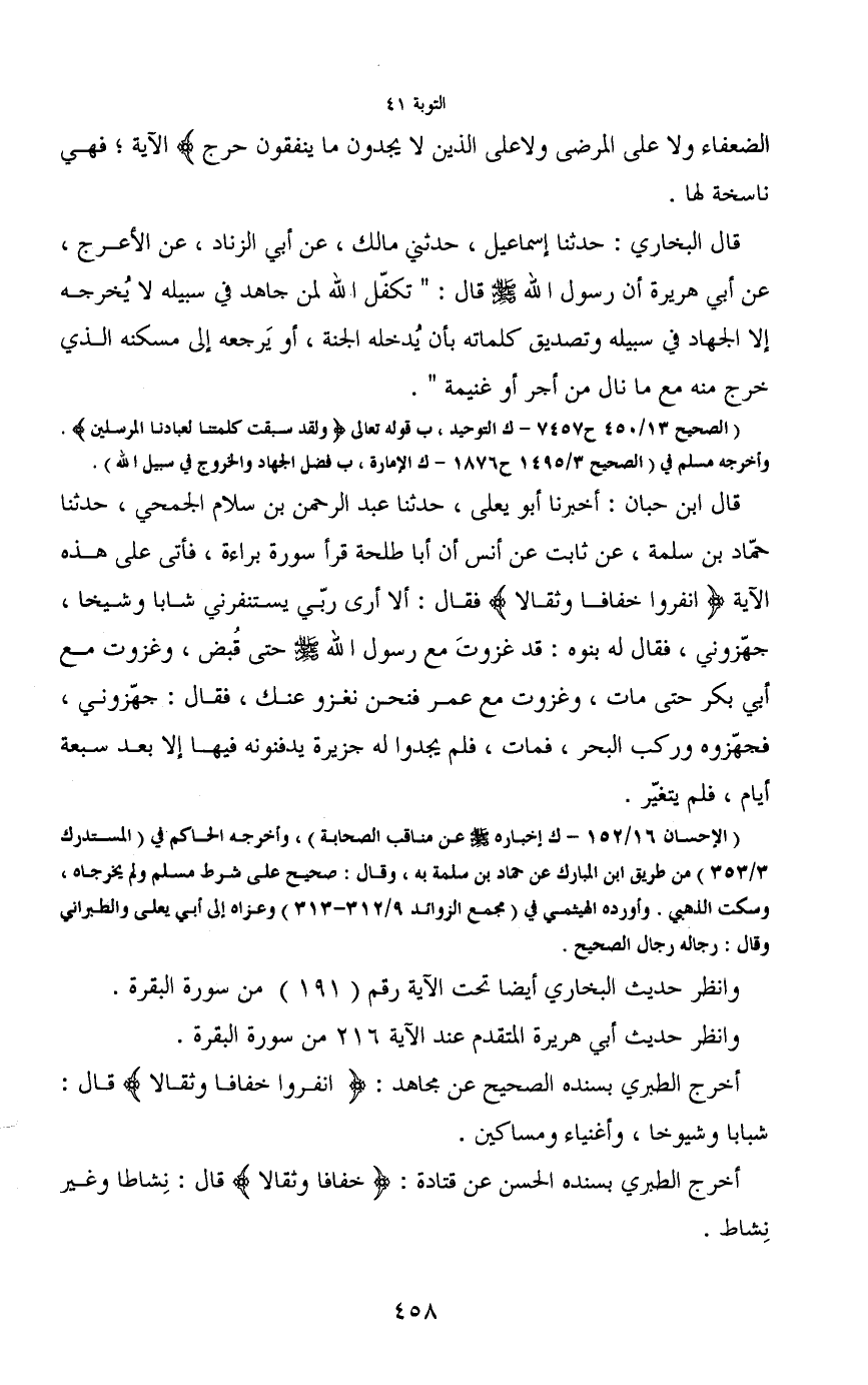 أخرج الطبري بسنده الصحيح عن مجاهد: (انفروا خفافا وثقالا) قال: شبابا وشيوخا، وأغنياء ومساكين.