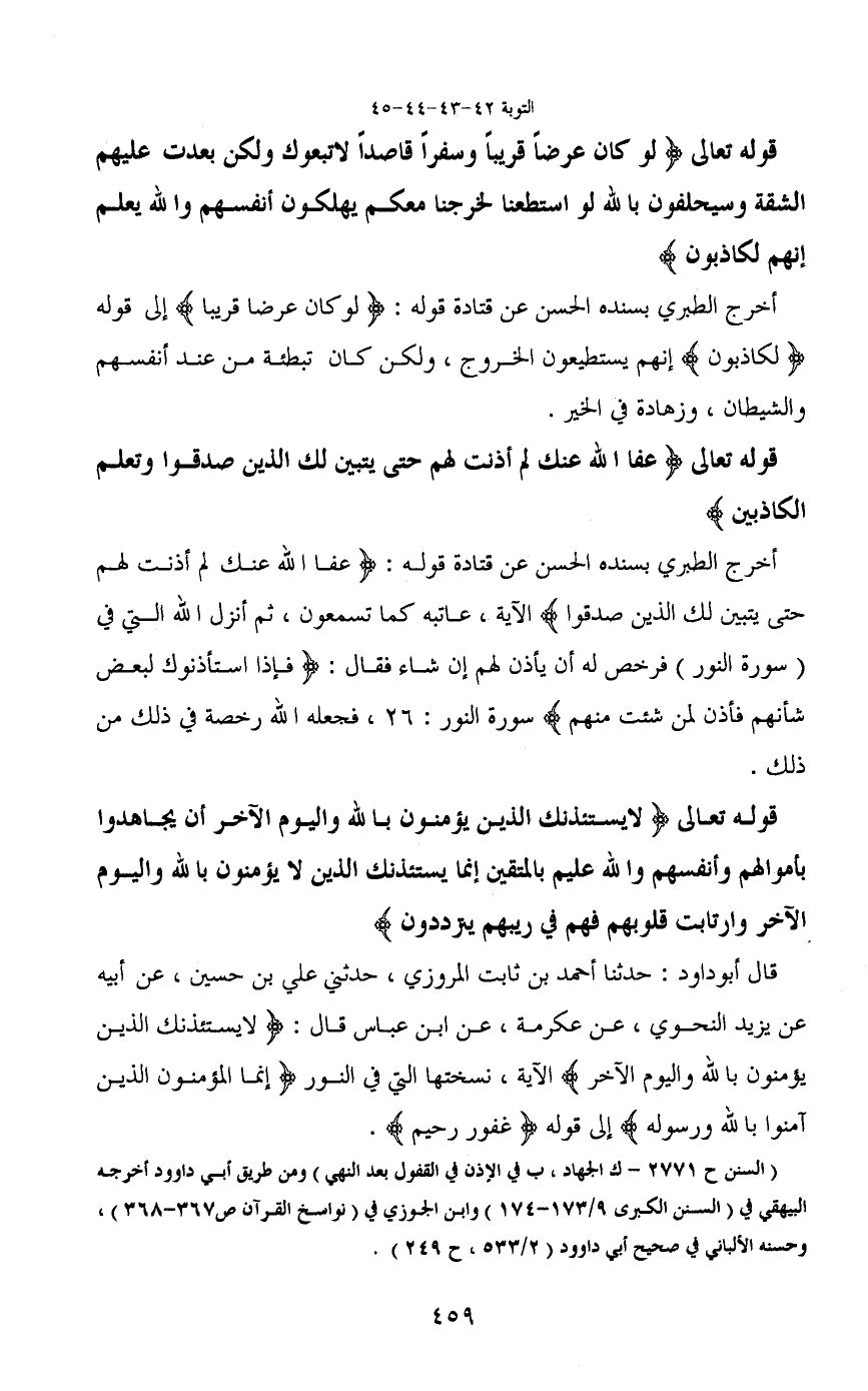 أخرج الطبري بسنده الحسن عن قتادة قوله: (عفا الله عنك لم أذنت لهم حتى يتبين لك الذين صدقوا) الآية، عاتبه كما تسمعون، ثم أنزل الله التي في (سورة النور) فرخص له أن يأذن لهم إن شاء فقال: (فإذا استأذنوك لبعض شأنهم فأذن لمن شئت منهم) سورة النور: 26، فجعله الله رخصة في ذلك من ذلك.