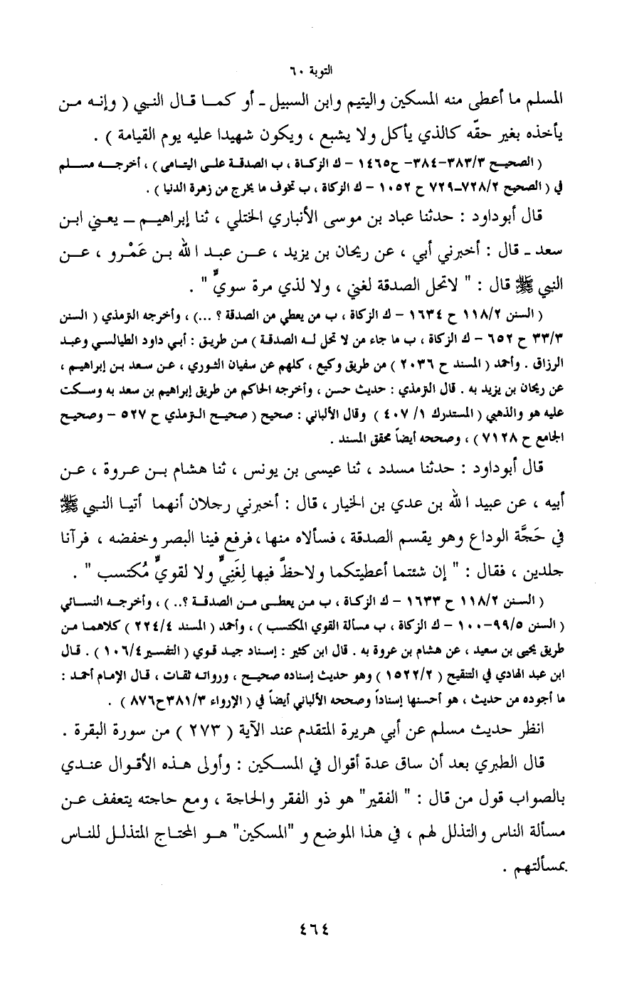 (السنن 2/118 ح 1634 - ك الزكاة، ب من يعطي من الصدقة؟ ... ) ، وأخرجه الترمذي (السنن 3/33 ح 652 - ك الزكاة، ب ما جاء من لا تحل له الصدقة) من طريق: أبي داود الطيالسي وعبد الرزاق. وأحمد (المسند ح 2036) من طريق وكيع، كلهم عن سفيان الثوري، عن سعد بن إبراهيم، عن ريحان بن يزيد به. قال الترمذي: حديث حسن، وأخرجه الحاكم من طريق إبراهيم بن سعد به وسكت عليه هو والذهبي (المستدرك 1/407) وقال الألباني: صحيح (صحيح الترمذي ح 527 - وصحيح الجامع ح 7128) ، وصححه أيضاً محقق المسند.