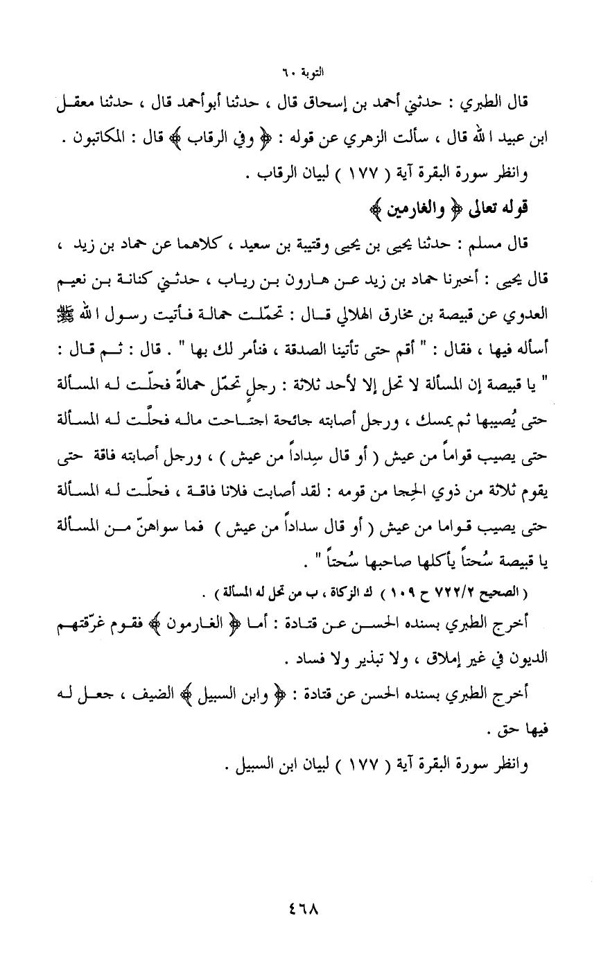 قال مسلم: حدثنا يحيى بن يحيى وقتيبة بن سعيد، كلاهما عن حماد بن زيد، قال يحيى: أخبرنا حماد بن زيد عن هارون بن رياب، حدثني كنانة بن نعيم العدوي عن قبيصة بن مخارق الهلالي قال: تحمّلت حمالة فأتيت رسول الله - صَلَّى اللَّهُ عَلَيْهِ وَسَلَّمَ - أسأله فيها، فقال: "أقم حتى تأتينا الصدقة، فنأمر لك بها". قال: ثم قال: "يا قبيصة إن المسألة لا تحل إلا لأحد ثلاثة: رجلٍ تحمّل حمالةٌ فحلّت له المسألة حتى يُصيبها ثم يمسك، ورجل أصابته جائحة اجتاحت ماله فحلّت له المسألة حتى يصيب قواماً من عيش (أو قال سِداداً من عيش) ، ورجل أصابته فاقة حتى يقوم ثلاثة من ذوي الحِجا من قومه: لقد أصابت فلانا فاقة، فحلّت له المسألة حتى يصيب قواما من عيش (أو قال سداداً من عيش) فما سواهنّ من المسألة يا قبيصة سُحتاً يأكلها صاحبها سُحتاً".