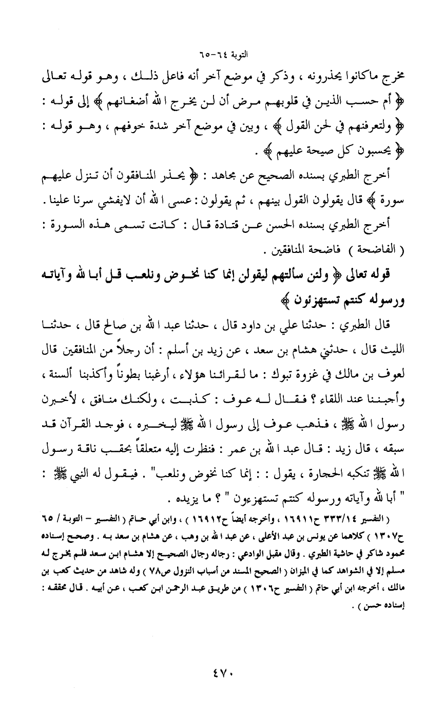 قال الطبري: حدثنا علي بن داود قال، حدثنا عبد الله بن صالح قال، حدثنا الليث قال، حدثني هشام بن سعيد، عن زيد بن أسلم: أن رجلاً من المنافقين قال لعوف بن مالك في غزوة تبوك: ما لقرائنا هؤلاء، أرغبنا بطوناً وأكذبنا ألسنة، وأجبننا عند اللقاء؟ فقال له عوف: كذبت، ولكنك منافق، لأخبرن رسول الله - صَلَّى اللَّهُ عَلَيْهِ وَسَلَّمَ -، فذهب عوف إلى رسول الله - صَلَّى اللَّهُ عَلَيْهِ وَسَلَّمَ - ليخبره، فوجد القرآن قد سبقه، قال زيد: قال عبد الله بن عمر: فنظرت إليه متعلقاً بحقب ناقة رسول الله - صَلَّى اللَّهُ عَلَيْهِ وَسَلَّمَ - تنكبه الحجارة، يقول: "إنما كنا نخوض ونلعب". فيقول له النبي - صَلَّى اللَّهُ عَلَيْهِ وَسَلَّمَ -: "أبالله وآياته ورسوله كنتم تستهزءون"؟ ما يزيده.