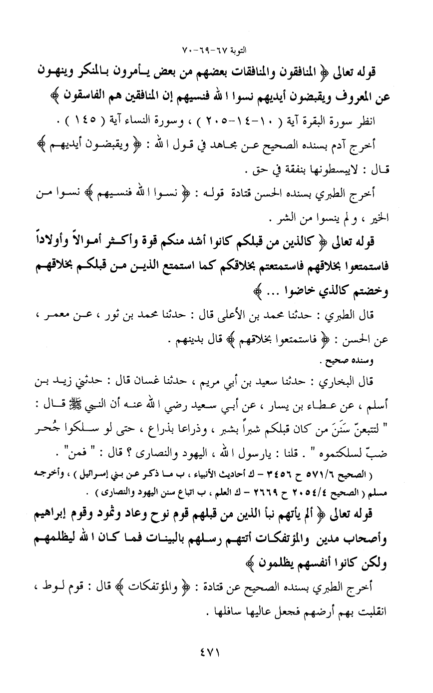قوله تعالى (كالذين من قبلكم كانوا أشد منكم قوة وأكثر أموالاً وأولاداً فاستمتعوا بخلاقهم فاستمتعتم بخلاقكم كما استمتع الذين من قبلكم بخلاقهم وخضتم كالذي خاضوا ... )