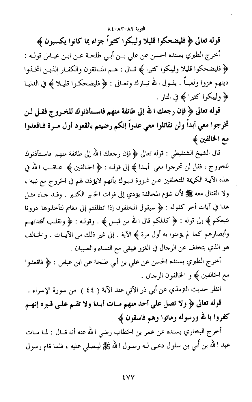 قال الشيخ الشنقيطي: قوله تعالى (فإن رجعك الله إلى طائفة منهم فاستأذنوك للخروج، فقل لن تخرجوا معي أبداً) إلى قوله: (الخالفين) عاقب الله في هذه الآية الكريمة المتخلفين عن غزوة تبوك بأنهم لا يؤذن لهم في الخروج مع نبيه، ولا القتال معه - صَلَّى اللَّهُ عَلَيْهِ وَسَلَّمَ - لأن شؤم المخالفة يؤدي إلى فوات الخير الكثير. وقد جاء مثل هذا في آيات أخر كقوله: (سيقول المخلفون إذا انطلقتم إلى مغانم لتأخذوها ذرونا نتبعكم) إلى قوله: (كذلكم قال الله من قبل) . وقوله: (ونقلب أفئدتهم وأبصارهم كما لم يؤمنوا به أول مرة) الآية. إلى غير ذلك من الآيات. والخالف هو الذي يتخلف عن الرجال في الغزو فيبقى مع النساء والصبيان.