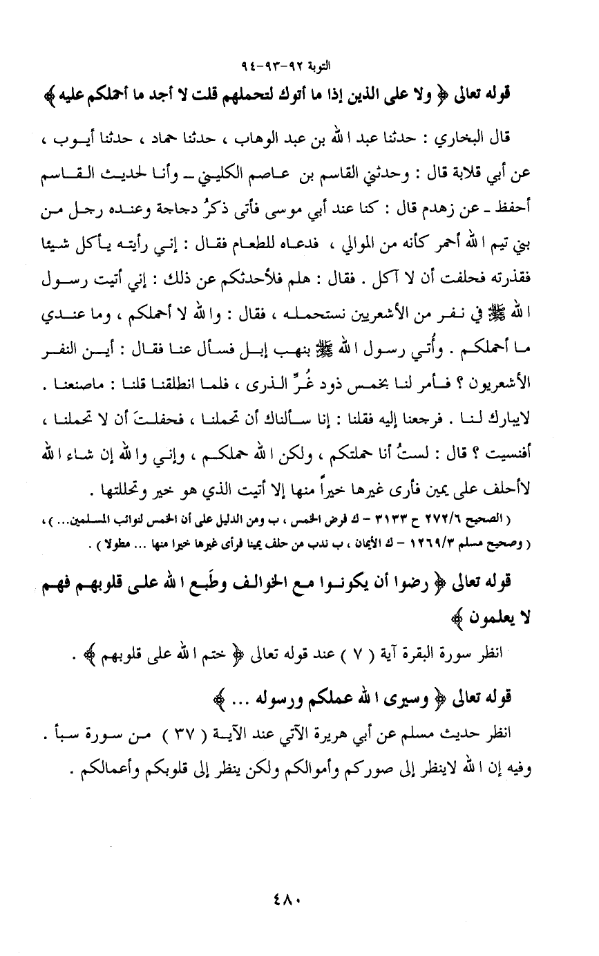 قال البخاري: حدثنا عبد الله بن عبد الوهاب، حدثنا حماد، حدثنا أيوب، عن أبي قلابة قال: وحدثني القاسم بن عاصم الكليني -وأنا لحديث القاسم أحفظ- عن زهدم قال: كنا عند أبي موسى فأتى ذكرُ دجاجة وعنده رجل من بني تيم الله أحمر كأنه من الموالي، فدعاه للطعام فقال: إني رأيته يأكل شيئاً فقذرته فحلفت أن لا أكل. فقال: هلم فلأحدثكم عن ذلك: إني أتيت رسول الله - صَلَّى اللَّهُ عَلَيْهِ وَسَلَّمَ - في نفر من الأشعريين نستحمله، فقال: والله لا أحملكم، وما عندي ما أحملكم. وأُتي رسول الله - صَلَّى اللَّهُ عَلَيْهِ وَسَلَّمَ - بنهب إبل فسأل عنا فقال: أين النفر الأشعريون؟ فأمر لنا بخمس ذود غُرِّ الذرى، فلما انطلقنا قلنا: ما صنعنا. لا يبارك لنا. فرجعنا إليه فقلنا: إنا سألناك أن تحملنا، فحفلتَ أن لا تحملنا، أفنسيت؟ قال: لستُ أنا حملتكم، ولكن الله حملكم، وإني والله إن شاء الله لا أحلف على يمين فأرى غيرها خيراً منها إلا أتيت الذي هو خير وتحللتها.