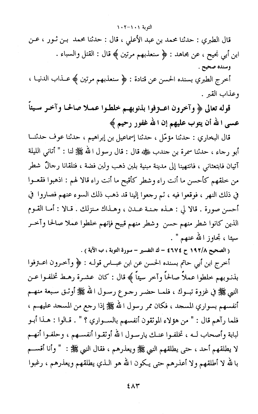 أخرج ابن أبي حاتم بسنده الحسن عن ابن عباس قوله: (وآخرون اعترفوا بذنوبهم خلطوا عملاً صالحاً وآخر سيئاً) قال: كان عشرة رهط تخلفوا عن النبي - صَلَّى اللَّهُ عَلَيْهِ وَسَلَّمَ - في غزوة تبوك، فلما حضر رجوع رسول الله - صَلَّى اللَّهُ عَلَيْهِ وَسَلَّمَ - أوثق سبعة منهم أنفسهم بسواري المسجد، فكان ممر رسول الله - صَلَّى اللَّهُ عَلَيْهِ وَسَلَّمَ - إذا رجع من المسجد عليهم، فلما رآهم قال: "من هؤلاء الموثقون أنفسهم بالسواري؟ ". قالوا: هذا أبو لبابة وأصحاب له، تخلفوا عنك يا رسول الله أوثقوا أنفسهم، وحلفوا أنهم لا يطلقهم أحد، حتى يطلقهم النبي - صَلَّى اللَّهُ عَلَيْهِ وَسَلَّمَ - ويعذرهم، فقال النبي - صَلَّى اللَّهُ عَلَيْهِ وَسَلَّمَ -: "وأنا أقسم بالله لا أطلقهم ولا أعذرهم حتى يكون الله هو الذي يطلقهم ويعذرهم، رغبوا