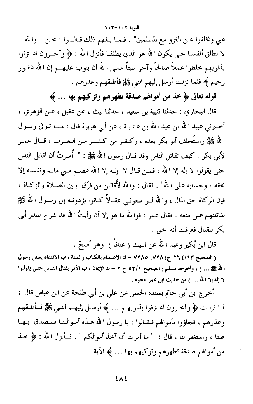 قال البخاري: حدثنا قتيبة بن سعيد، حدثنا ليث، عن عقيل، عن الزهري، أخبرني عبيد الله بن عبد الله بن عتبة، عن أبي هريرة قال: لما توفي رسول الله - صَلَّى اللَّهُ عَلَيْهِ وَسَلَّمَ - واستُخلف أبو بكر بعبده، وكفر من كفر من العرب، قال عمر لأبي بكر: كيف تقاتل الناس وقد قال رسول الله - صَلَّى اللَّهُ عَلَيْهِ وَسَلَّمَ -: "أمرتُ أن أقاتل الناس حتى يقولوا لا إله إلا الله، فمن قال لا إله إلا الله عصم مني ماله ونفسه إلا بحقه، وحسابه على الله". فقال: والله لأُقاتلن من فرّق بين الصلاة والزكاة، فإن الزكاة حق المال، والله لو منعوني عقالاً كانوا يؤدونه إلى رسول الله - صَلَّى اللَّهُ عَلَيْهِ وَسَلَّمَ - لقاتلتهم على منعه. فقال عمر: فوالله ما هو إلا أن رأيتُ الله قد شرح صدر أبي بكر للقتال فعرفت أنه الحق.