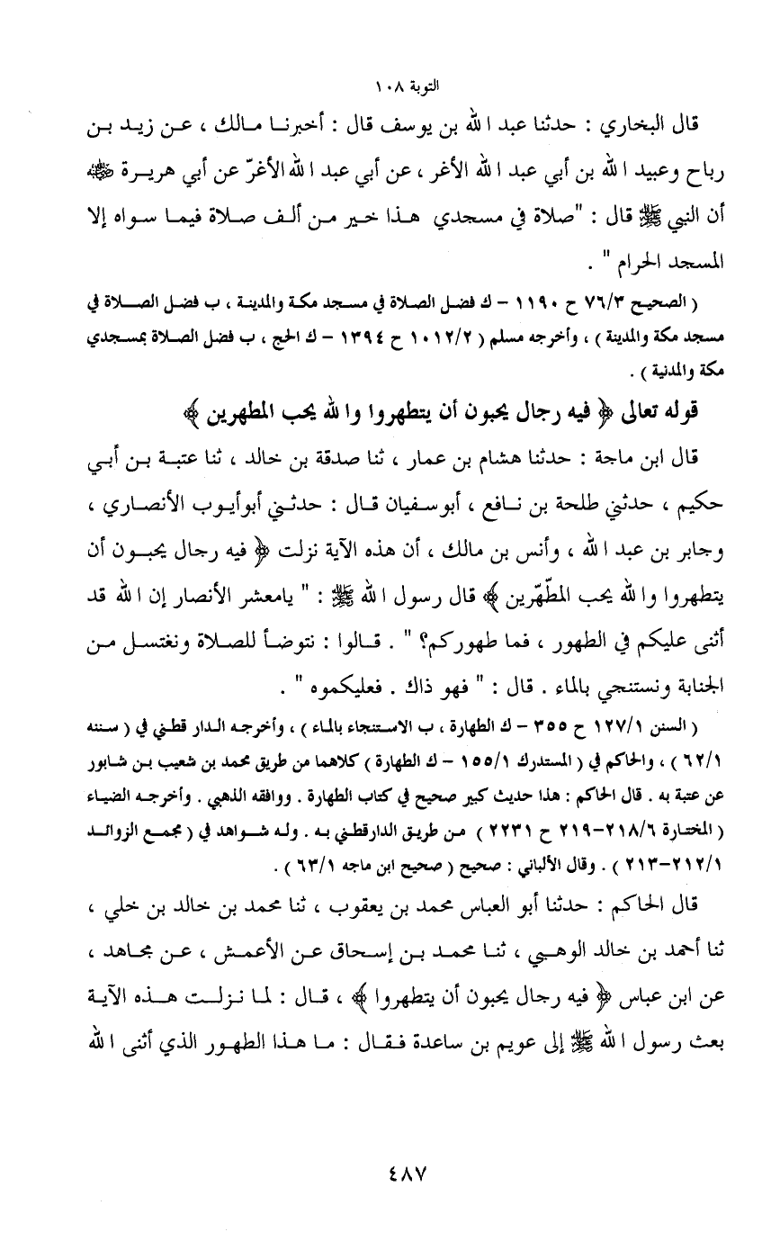 قال ابن ماجة: حدثنا هشام بن عمار، ثنا صدقة بن خالد، ثنا عتبة بن أبي حكيم، حدثني طلحة بن نافع، أبو سفيان قال: حدثني أبو أيوب الأنصاري، وجابر بن عبد الله، وأنس بن مالك، أن هذه الآية نزلت (فيه رجال يحبون أن يتطهروا والله يحب المطهّرين) قال رسول الله - صَلَّى اللَّهُ عَلَيْهِ وَسَلَّمَ -: "يا معشر الأنصار إن الله قد أثنى عليكم في الطهور، فما طهوركم؟ ". قالوا: نتوضأ للصلاة ونغتسل من الجنابة ونستنجي بالماء. قال: "فهو ذاك. فعليكموه".
