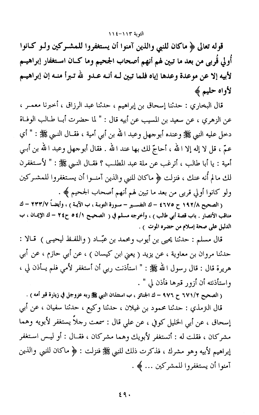 قال البخاري: حدثنا إسحاق بن إبراهيم، حدثنا عبد الرزاق، أخبرنا معمر، عن الزهري، عن سعيد بن المسيب عن أبيه قال: "لما حضرت أبا طالب الوفاة دخل عليه النبي - صَلَّى اللَّهُ عَلَيْهِ وَسَلَّمَ - وعنده أبو جهل وعبد الله بن أبي أمية، فقال النبي - صَلَّى اللَّهُ عَلَيْهِ وَسَلَّمَ -: "أي عمّ، قل لا إله إلا الله، أحاجّ لك بها عند الله. فقال أبو جهل وعبد الله بن أبي أمية: يا أبا طالب، أترغب عن ملة عبد المطلب؟ فقال النبي - صَلَّى اللَّهُ عَلَيْهِ وَسَلَّمَ -: "لأستغفرن لك ما لم أُنه عنك"، فنزلت (ما كان للنبي والذين آمنوا أن يستغفروا للمشركين ولو كانوا أولي قربى من بعد ما تبين لهم أنهم أصحاب الجحيم) .