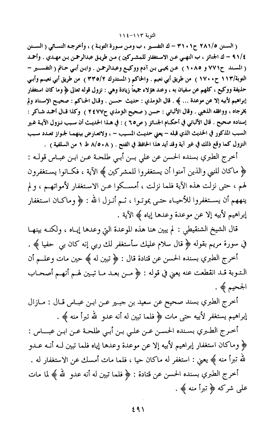 أخرج الطبري بسنده الحسن عن علي بن أبي طلحة عن ابن عباس قوله: (ما كان للنبي والذين آمنوا أن يستغفروا للمشركين) الآية، فكانوا يستغفرون لهم، حتى نزلت هذه الآية فلما نزلت، أمسكوا عن الاستغفار لأمواتهم، ولم ينههم أن يستغفروا للأحياء حتى يموتوا، ثم أنزل الله: (وما كان استغفار إبراهيم لأبيه إلا عن موعدة وعدها إياه) الآية.
