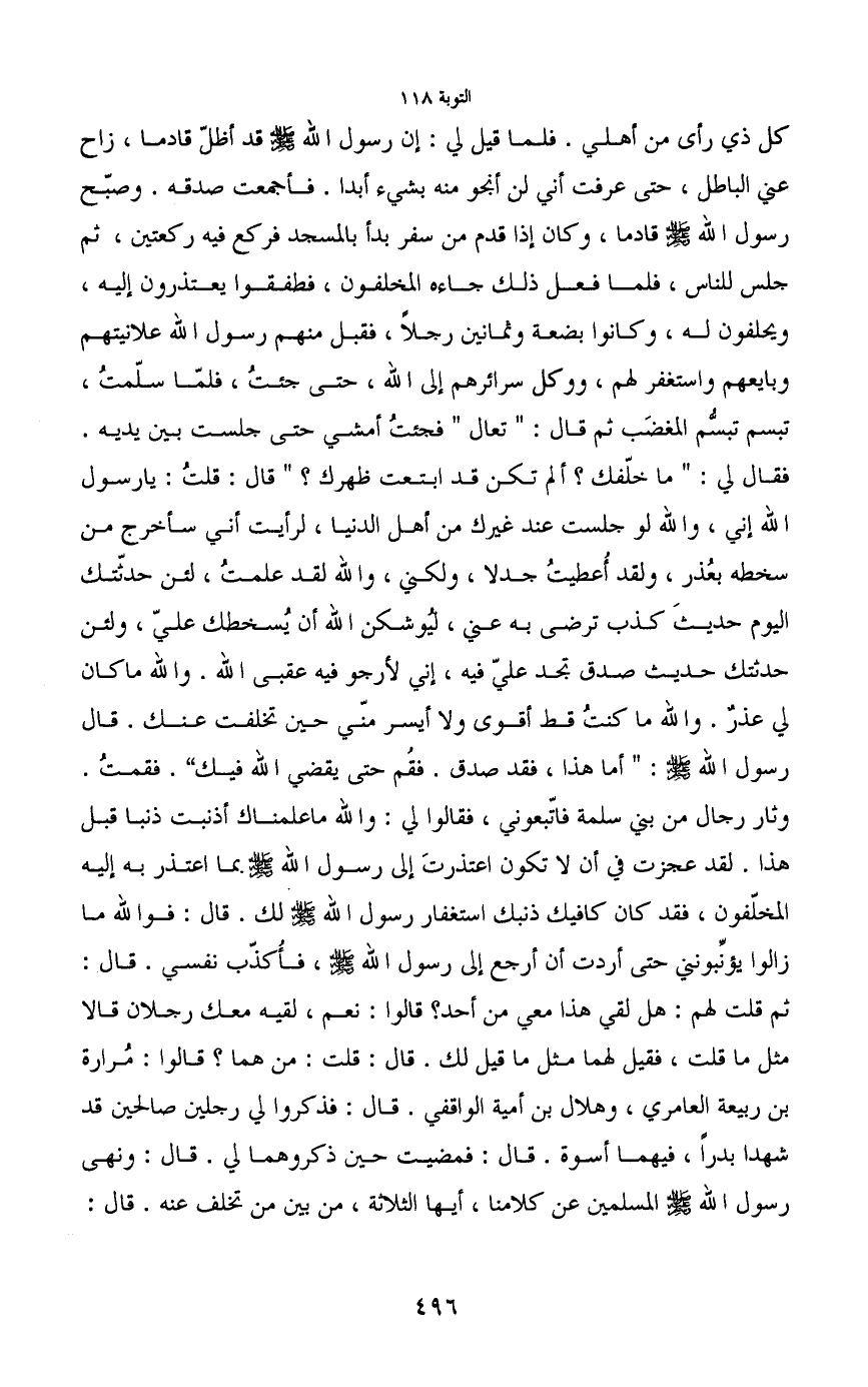 كل ذي رأى من أهلي. فلما قيل لي: إن رسول الله - صَلَّى اللَّهُ عَلَيْهِ وَسَلَّمَ - قد أظلّ قادما، زاح عني الباطل، حتى عرفت أني لن أنجو منه بشيء أبداً. فأجمعت صدقه. وصبّح رسول الله - صَلَّى اللَّهُ عَلَيْهِ وَسَلَّمَ - قادما، وكان إذا قدم من سفر بدأ بالمسجد فركع فيه ركعتين، ثم جلس للناس، فلما فعل ذلك جاءه المخلفون، فطفقوا يعتذرون إليه، ويحلفون له، وكانوا بضعة وثمانين رجلاً، فقبل منهم رسول الله علانيتهم وبايعهم واستغفر لهم، ووكل سرائرهم إلى الله، حتى جئتُ، فلمّا سلّمتُ، تبسم تبسُّم المغضبَ ثم قال: "تعال" فجئتُ أمشي حتى جلست بين يديه.