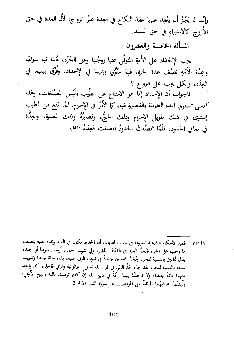 فالجواب أن الإِحداد إنما هو الامتناع عن الطِّيب وَلَبْسِ المصْبَغات، وهَذا المعنى تستوي المدة الطويلة والقصيرة فيه، كما الأمرُ في الإِحرام، لمَّا مَنَع من الطيب إستوى في ذلك طويل الإِحرام وذلك الحجُّ، وقصيرُهُ وذلك العمرة، والعِدَّة في معاني الحدود، فلَمَّا تَنَصَّفتْ الحدودُ تنصفتْ العِدَدُ. (١٤٣)