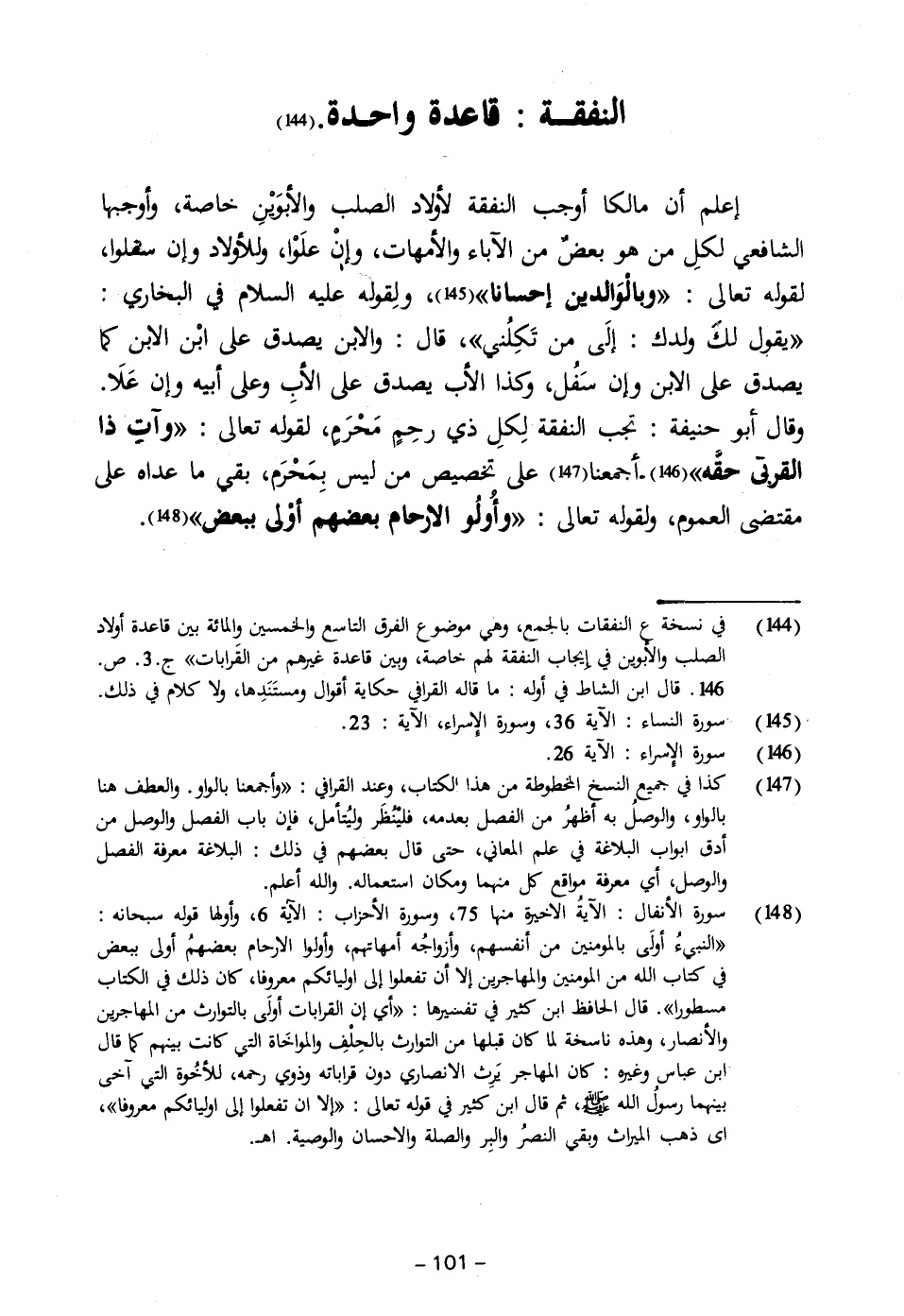 (١٤٤) في نسخة ع النفقات بالجمع، وهي موضوع الفرق التاسع والخمسين والمائة بين قاعدة أولاد الصلب والأبوين في إيجاب النفقة لهم خاصة، وبين قاعدة غيرهم من القَرابات" جـ ٣. ص. ١٤٦. قال ابن الشاط في أوله: ما قاله القرافي حكاية أقوال ومستَنَدِها، ولا كلام في ذلك.