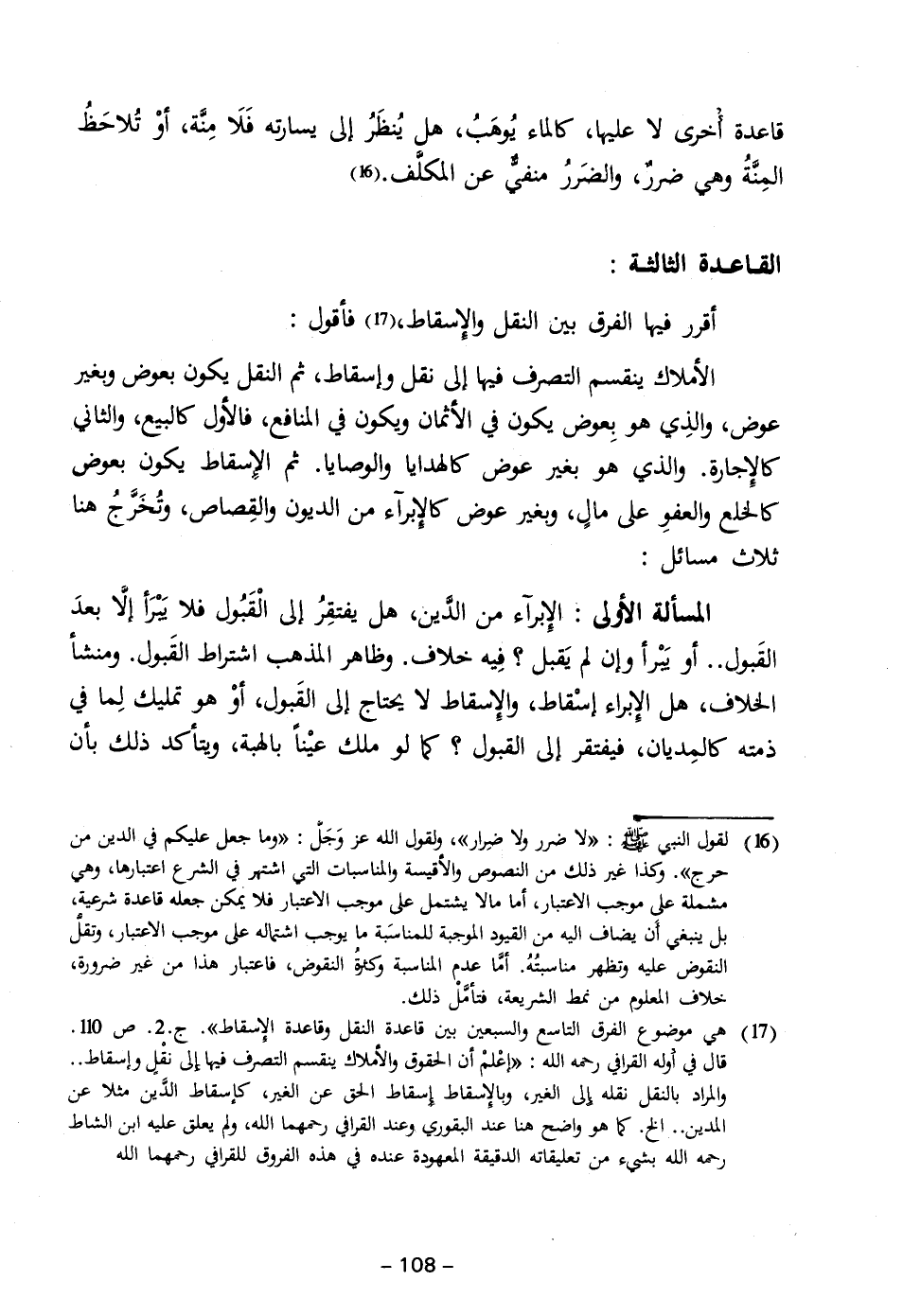 (١٧) هي موضوع الفرق التاسع والسبعين بين قاعدة النقل وقاعدة الإِسقاط". جـ ٢. ص ١١٠. قال في أوله القرافي رحمه الله: "إعْلمْ أن الحقوق والأملاك ينقسم التصرف فيها إلى نقْلٍ وإسقاط .. والمراد بالنقل نقله إِلى الغير، وبالإِسقاط إِسقاط الحق عن الغير، كإسقاط الدَّين مثلا عن المدين .. الخ. كما هو واضح هنا عند البقوري وعند القرافي رحهما الله، ولم يعلق عليه ابن الشاط رحمه الله بشيء من تعليقاته الدقيقة المعهودة عنده في هذه الفروق للقرافي رحمهما الله