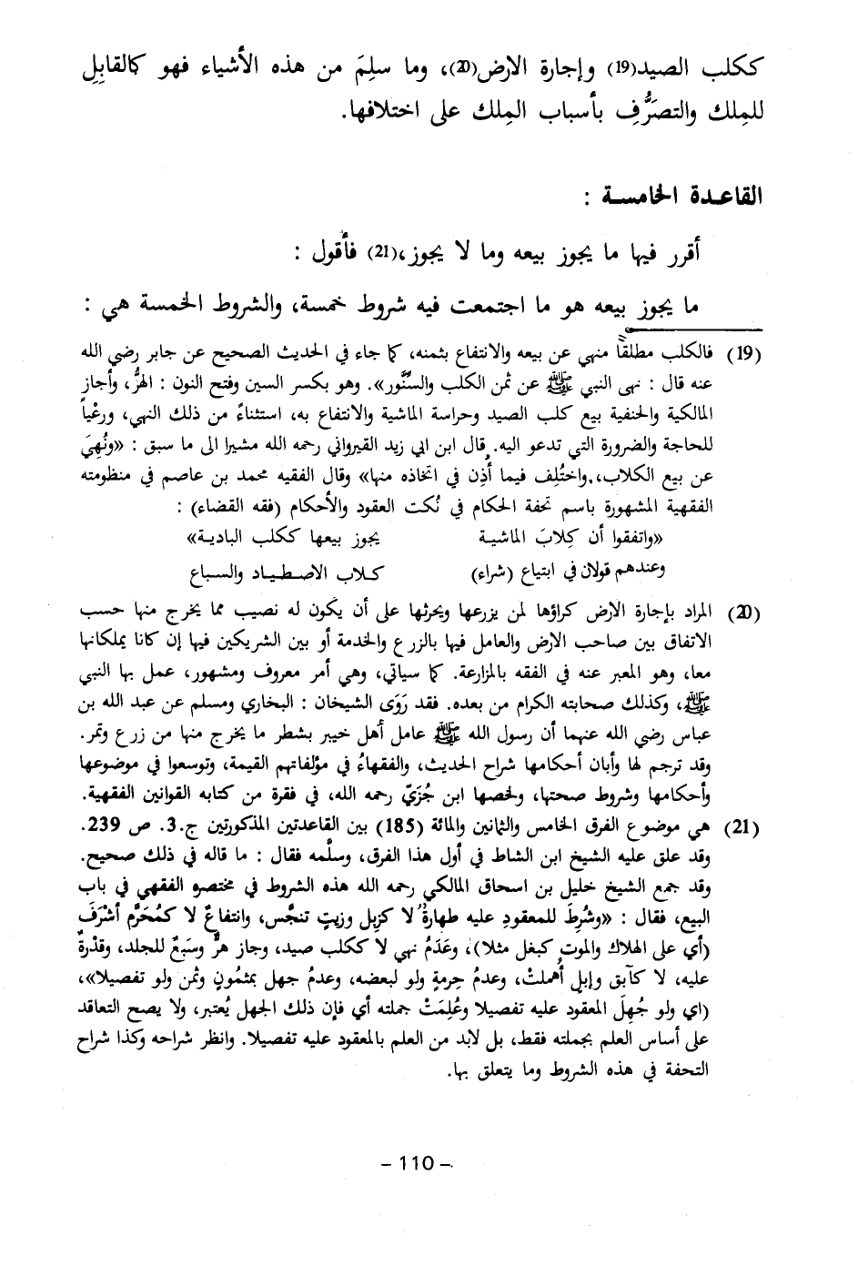 (٢١) هي موضوع الفرق الخامس والثمانين والمائة (١٨٥) بين القاعدتين المذكورتين جـ ٣. ص ٢٣٩. وقد علق عليه الشيخ ابن الشاط في أول هذا الفرق، وسلَّمه فقال: ما قاله في ذلك صحيح. وقد جمع الشيخ خليل بن اسحاق المالكي رحمه الله هذه الشروط في مختصره الفقهي في باب البيع، فقال: "وشُرِطَ للمعقودِ عليه طهارةٌ لا كزِبل وزيتٍ تنجَّس، وانتفاعٌ لا كمُحَرَّم أشْرَفَ (أي على الهلاك والموت كبغل مثلا)، وعَدَمُ نهي لا ككلب صيد، وجاز هرٌّ وسَبعٌ للجلد، وقدْرةٌ عليه، لا كآبق وإبلٍ أهُملتْ، وعدمُ حِرمةٍ ولو لبعضه، وعدمُ جهل بمثمُونٍ وثمن ولو تفصيلا"، (اى ولو جُهِلَ المعقود عليه تفصيلا وعُلِمَتْ جملته أي فإن ذلك الجهل يُعتبر، ولا يصح التعاقد على أساس العلم بجملته فقط، بل لابد من العلم بالمعقود عليه تفصيلا. وانظر شراحه وكذا شراح التحفة في هذه الشروط وما يتعلق بها.