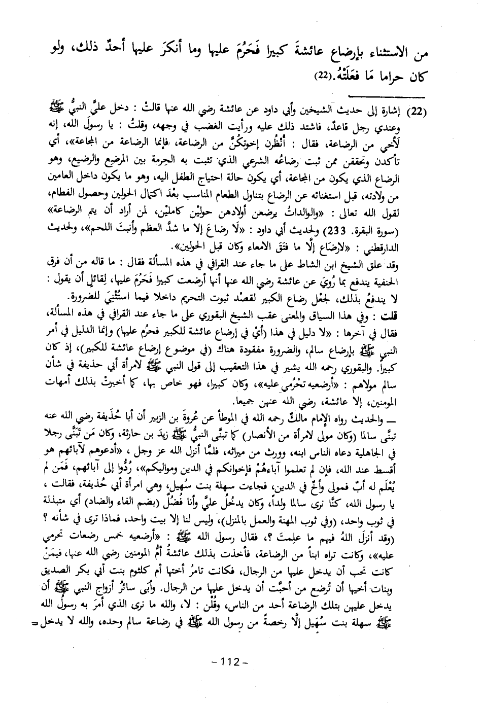 من الاستثناء بإرضاع عائشةَ كبيرا فَحَرُمَ عليها وما أنكرَ عليها أحدٌ ذلك، ولو كان حراما مَا فعَلَتْهُ. (٢٢)