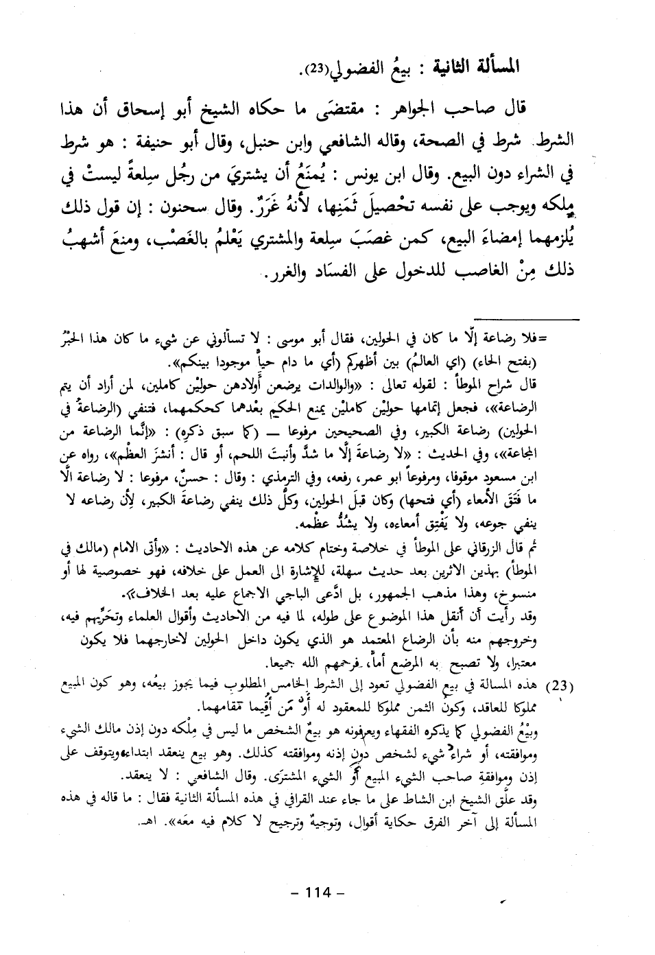 (٢٣) هذه المسالة في بيع الفضولي تعود إلى الشرط الخامس المطلوبِ فيما يجوز بيعُه، وهو كون المبيع مملوكا للعاقد، وكون الثمن مملوكا للمعقود له أَوْ مَن أُقِيما مَقامهما.