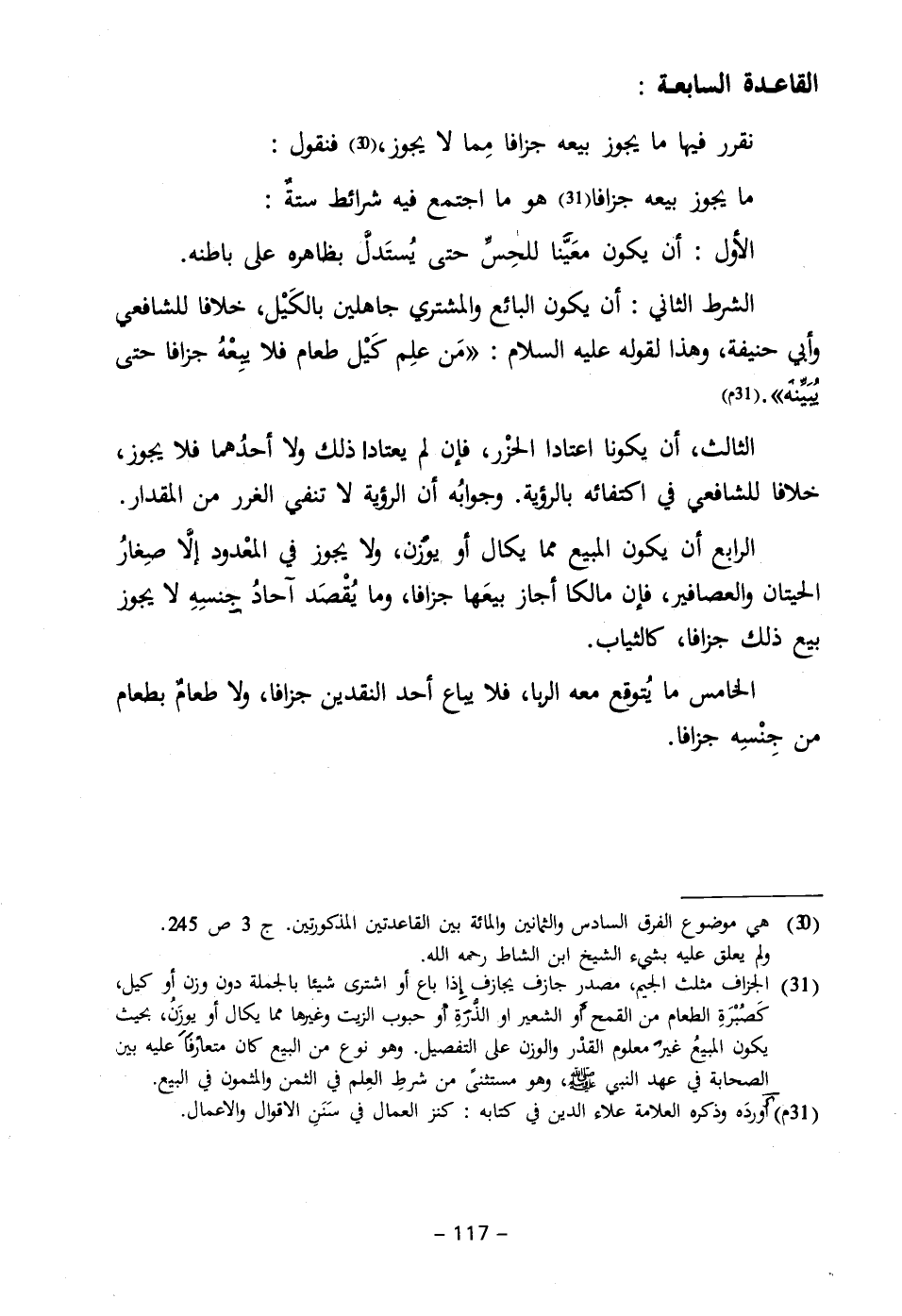 (٣١) الجزاف مثلث الجيم، مصدر جازف يجازف إِذا باع أو اشترى شيئا بالجملة دون وزن أو كيل، كَصُبْرَةِ الطعام من القمح أَو الشعير او الذُّرَةِ أْو حبوب الزيت وغيرها مما يكال أو يوزَنُ، بحيث يكون المبيعُ غيرَ معلوم القدْر والوزن على التفصيل. وهو نوع من البيع كان متعارفًا عليه بين الصحابة في عهد النبي - صلى الله عليه وسلم -، وهو مستثنىً من شرطِ العِلم في الثمن والمثمون في البيع.