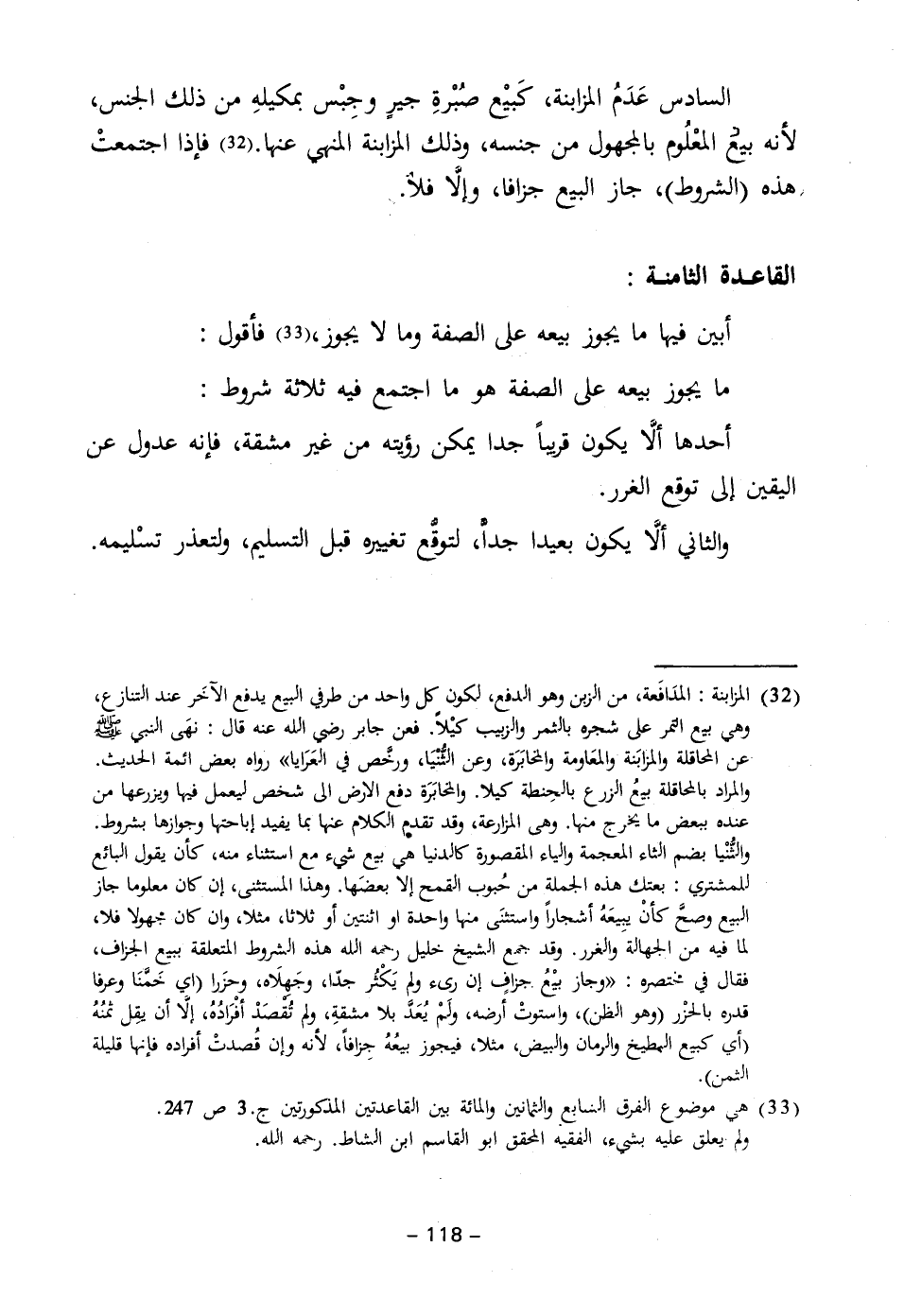 (٣٣) هي موضوع الفرق السابع والثمانين والمائة بين القاعدتين المذكورتين جـ ٣ ص ٢٤٧. ولم يعلق عليه بشيء، الفقيه المحقق ابو القاسم ابن الشاط. رحمه الله.