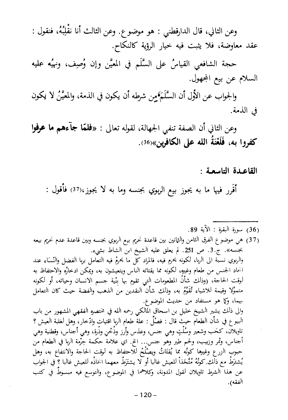 (٣٧) موضوع الفرق الثامن والثمانين بين قاعدة تحريم بيع الربوي بجنسه وبين قاعدة عدم تحريم بيعه بجنسه". جـ ٣. ص ٢٥١. لم يعلق عليه الشيخ ابن الشاط بشيء.