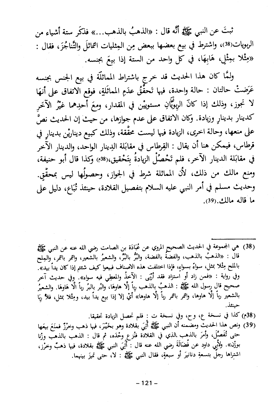ولمَّا كان هذا الحديث قد خرج باشتراط المماثلَة في بيع الجنس بجنسه عَرَضتْ حالتان: حالة واحدة، فيها تَحقُّقُ عدَم المماثَلةِ، فوقع الاتفاق على أنهَا لا تجوز، وذلك إذا كانَ الرِبويَّانِ مستوييْن في المقدار، ومعَ أحدِهما غيْرُ الآخَرِ كدينار بدينارٍ وزيادة. وكان الاتفاق على عدم جوازها، من حيث إن الحديث نصَّ على منعها، وحالة اخرى، الزيادة فيها ليست محقَّقة، وذلك كبيع ديناريْن بدينارٍ في قرطاس، فيمكن هنا أن يقال: القِرطاس في مقابَلة الدِينار الواحد، والدينار الآخر في مقابَلة الدينار الآخر، فلم تَحْصُلْ الزيادةُ بِتَحْقيق، (٣٨ م) وكذا قال أبو حنيفة، ومنع مالك من ذلك، لأن المماثلة شرط في الجواز، وحصولُها ليس بمحقَّقٍ. وحديث مسلم في أمر النبي عليه السلام بتفصيل القلادة، حينئذ تُبَاع، دليل على ما قاله مالك. (٣٩).