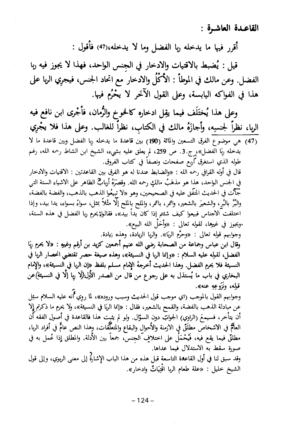 (٤٧) هي موضوع الفرق التسعين والمائة (١٩٠) بين قاعدة ما يدخله ربِا الفضل وبين قاعدة ما لا يدخله رِبَا الفضل"، جـ ٣. ص ٢٥٩، لم يعلق عليه بشيء، الشيخ ابن الشاط رحمه الله، رغم طوله الذي استغرق أربع صفحات ونصفاً في كتاب الفروق.