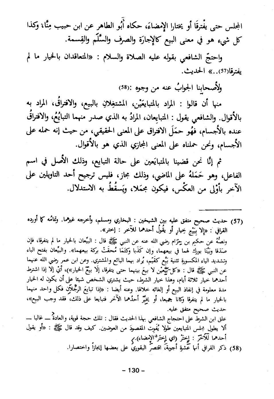 (٥٧) حديث صحيح متفق عليه بين الشيخين: البخاري ومسلم، وأخرجه غيرهما. وتمامُه كما أورده القرافي: "إلا بِبَيْعِ خِيارٍ أو يقُولُ أحدهما للآخر: إختر".