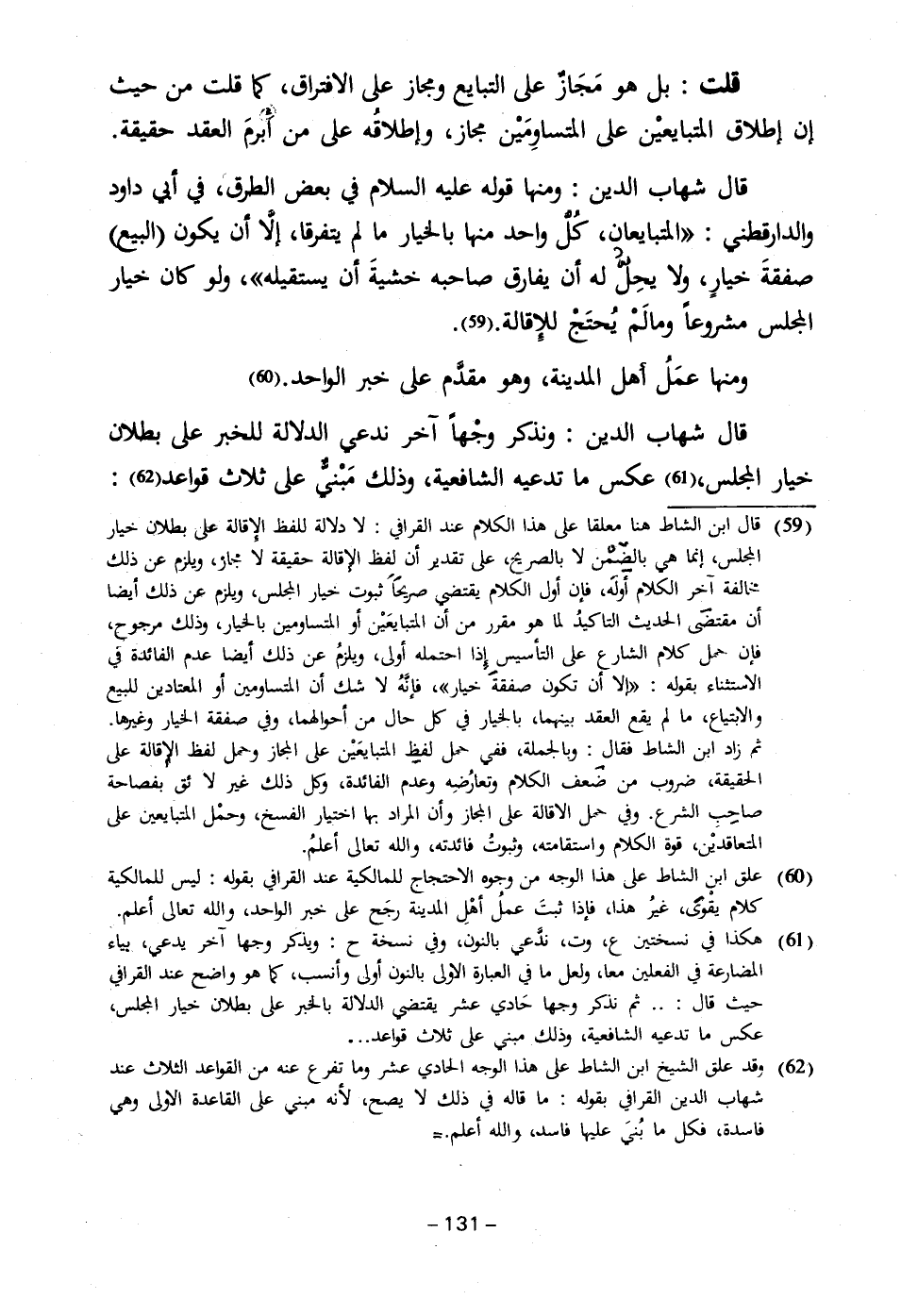 (٥٩) قال ابن الشاط هنا معلقا على هذا الكلام عند القرافي: لا دلالة للفظ الإقالة على بطلان خيار المجلس، إنما هي بالضِّمْن لا بالصريح، على تقدير أن لفظ الإقالة حقيقة لامجاز، ويلزم عن ذلك مخالفة آخر الكلام أولَه، فإن أول الكلام يقتضي صريحاً ثبوت خيار المجلس، ويلزم عن ذلك أيضا أن مقتضَى الحديث التاكيدُ لما هو مقرر من أن المتبايعَيْن أو المتساومين بالخيار، وذلك مرجوح، فإن. حمل كلام الشارع على التأسيس إِذا احتمله أولى، ويلزمُ عن ذلك أيضا عدم الفائدة في الاستثناء بقوله: "إلا أن تكون صفقةَ خيار"، فإنَّهُ لا شك أن المتساومين أو المعتادين للبيع والابتياع، ما لم يقع العقد بينهما، بالخيار فى كل حال من أحوالهما، وفي صفقة الخيار وغيرها. ثم زاد ابن الشاط فقال: وبالجملة، ففي حمل لفظِ المتبايعَيْن على المجاز وحمل لفظ الإِقالة على الحقيقة، ضروب من ضَعف الكلام وتعارُضِه وعدم الفائدة، وكل ذلك غير لا ئق بفصاحة صاحِبِ الشرع. وفي حمل الاقالة على المجاز وأن المراد با اختيار الفسخ، وحمْل المتبايعين على المتعاقديْن، قوة الكلام واستقامته، وثبوتُ فائدته، والله تعالى أعلمُ.